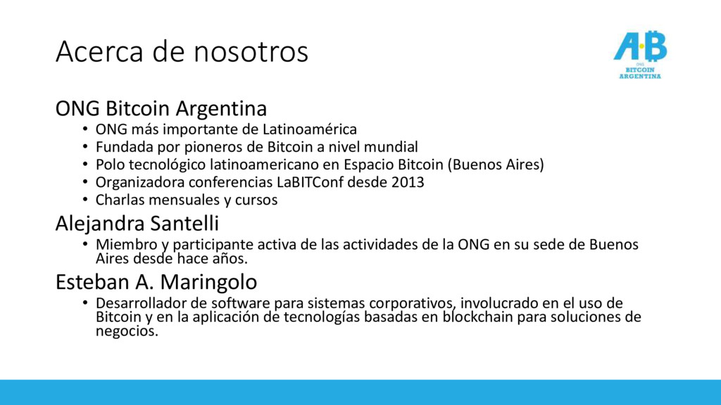 de Latinoamérica • Fundada por pioneros de Bitcoin a nivel mundial • Polo tecnológico latinoamericano en Espacio Bitcoin (Buenos Aires) • Organizadora conferencias LaBITConf desde 2013 • Charlas mensuales y cursos Alejandra Santelli • Miembro y participante activa de las actividades de la ONG en su sede de Buenos Aires desde hace años. Esteban A. Maringolo • Desarrollador de software para sistemas corporativos, involucrado en el uso de Bitcoin y en la aplicación de tecnologías basadas en blockchain para soluciones de negocios.