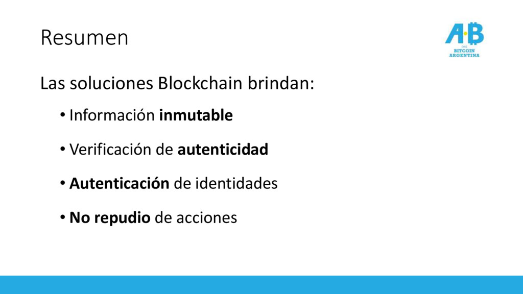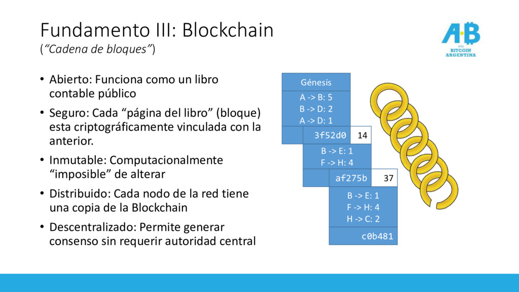 un libro contable público • Seguro: Cada “página del libro” (bloque) esta criptográficamente vinculada con la anterior. • Inmutable: Computacionalmente “imposible” de alterar • Distribuido: Cada nodo de la red tiene una copia de la Blockchain • Descentralizado: Permite generar consenso sin requerir autoridad central A -> B: 5 B -> D: 2 A -> D: 1 Génesis 3f52d0 B -> E: 1 F -> H: 4 14 af275b B -> E: 1 F -> H: 4 H -> C: 2 37 c0b481