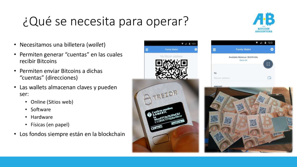 • Permiten generar “cuentas” en las cuales recibir Bitcoins • Permiten enviar Bitcoins a dichas “cuentas” (direcciones) • Las wallets almacenan claves y pueden ser: • Online (Sitios web) • Software • Hardware • Físicas (en papel) • Los fondos siempre están en la blockchain