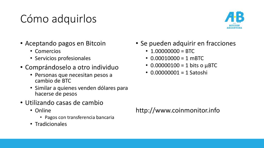 Servicios profesionales • Comprándoselo a otro individuo • Personas que necesitan pesos a cambio de BTC • Similar a quienes venden dólares para hacerse de pesos • Utilizando casas de cambio • Online • Pagos con transferencia bancaria • Tradicionales • Se pueden adquirir en fracciones • 1.00000000 = BTC • 0.00010000 = 1 mBTC • 0.00000100 = 1 bits o μBTC • 0.00000001 = 1 Satoshi http://www.coinmonitor.info