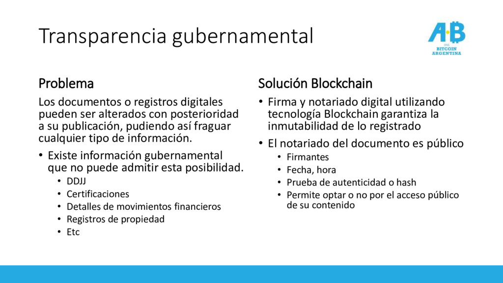 alterados con posterioridad a su publicación, pudiendo así fraguar cualquier tipo de información. • Existe información gubernamental que no puede admitir esta posibilidad. • DDJJ • Certificaciones • Detalles de movimientos financieros • Registros de propiedad • Etc Solución Blockchain • Firma y notariado digital utilizando tecnología Blockchain garantiza la inmutabilidad de lo registrado • El notariado del documento es público • Firmantes • Fecha, hora • Prueba de autenticidad o hash • Permite optar o no por el acceso público de su contenido