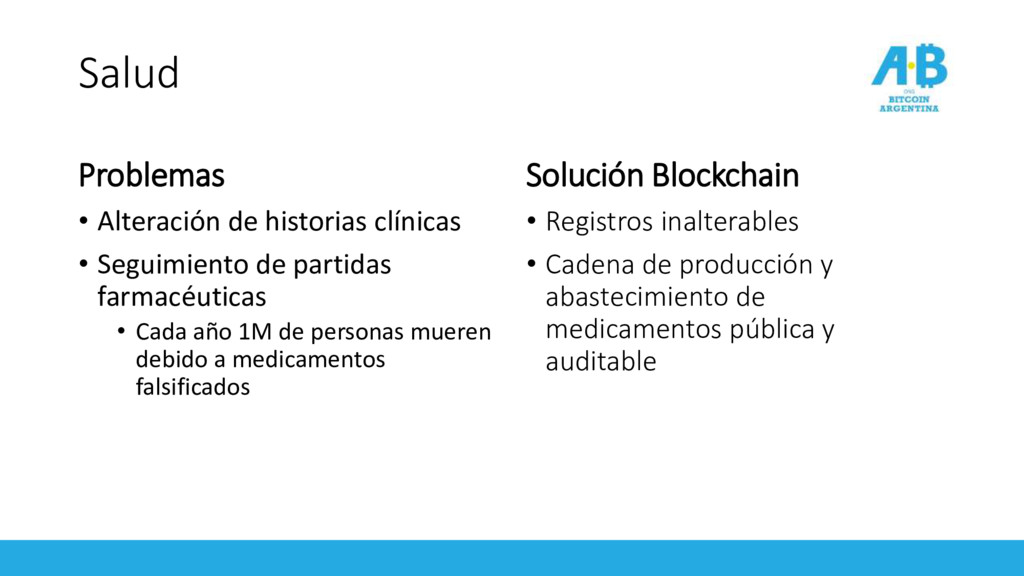 partidas farmacéuticas • Cada año 1M de personas mueren debido a medicamentos falsificados Solución Blockchain • Registros inalterables • Cadena de producción y abastecimiento de medicamentos pública y auditable