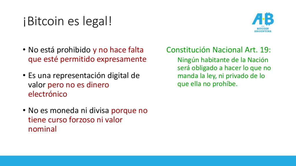 falta que esté permitido expresamente • Es una representación digital de valor pero no es dinero electrónico • No es moneda ni divisa porque no tiene curso forzoso ni valor nominal Constitución Nacional Art. 19: Ningún habitante de la Nación será obligado a hacer lo que no manda la ley, ni privado de lo que ella no prohíbe.