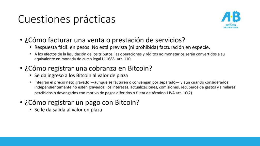 servicios? • Respuesta fácil: en pesos. No está prevista (ni prohibida) facturación en especie. • A los efectos de la liquidación de los tributos, las operaciones y réditos no monetarios serán convertidos a su equivalente en moneda de curso legal L11683, art. 110 • ¿Cómo registrar una cobranza en Bitcoin? • Se da ingreso a los Bitcoin al valor de plaza • Integran el precio neto gravado —aunque se facturen o convengan por separado— y aun cuando considerados independientemente no estén gravados: los intereses, actualizaciones, comisiones, recuperos de gastos y similares percibidos o devengados con motivo de pagos diferidos o fuera de término LIVA art. 10(2) • ¿Cómo registrar un pago con Bitcoin? • Se le da salida al valor en plaza
