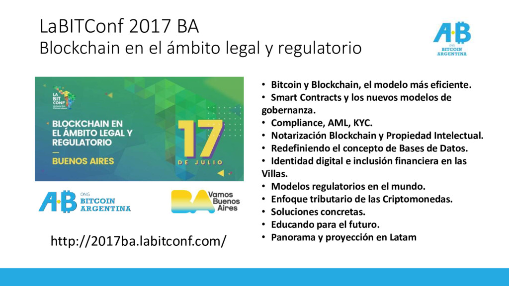 • Bitcoin y Blockchain, el modelo más eficiente. • Smart Contracts y los nuevos modelos de gobernanza. • Compliance, AML, KYC. • Notarización Blockchain y Propiedad Intelectual. • Redefiniendo el concepto de Bases de Datos. • Identidad digital e inclusión financiera en las Villas. • Modelos regulatorios en el mundo. • Enfoque tributario de las Criptomonedas. • Soluciones concretas. • Educando para el futuro. • Panorama y proyección en Latam http://2017ba.labitconf.com/