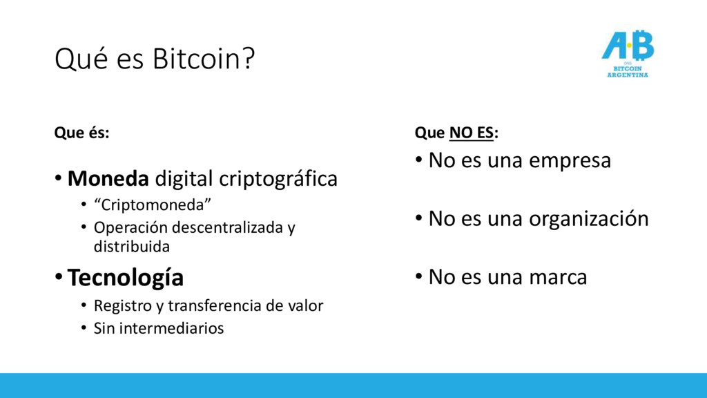 “Criptomoneda” • Operación descentralizada y distribuida •Tecnología • Registro y transferencia de valor • Sin intermediarios Que NO ES: • No es una empresa • No es una organización • No es una marca