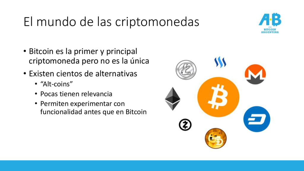 y principal criptomoneda pero no es la única • Existen cientos de alternativas • “Alt-coins” • Pocas tienen relevancia • Permiten experimentar con funcionalidad antes que en Bitcoin