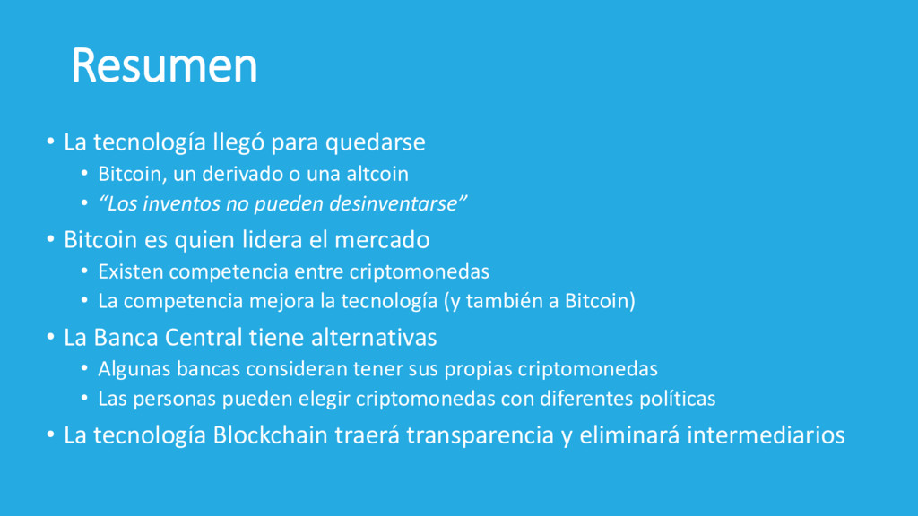 derivado o una altcoin • “Los inventos no pueden desinventarse” • Bitcoin es quien lidera el mercado • Existen competencia entre criptomonedas • La competencia mejora la tecnología (y también a Bitcoin) • La Banca Central tiene alternativas • Algunas bancas consideran tener sus propias criptomonedas • Las personas pueden elegir criptomonedas con diferentes políticas • La tecnología Blockchain traerá transparencia y eliminará intermediarios