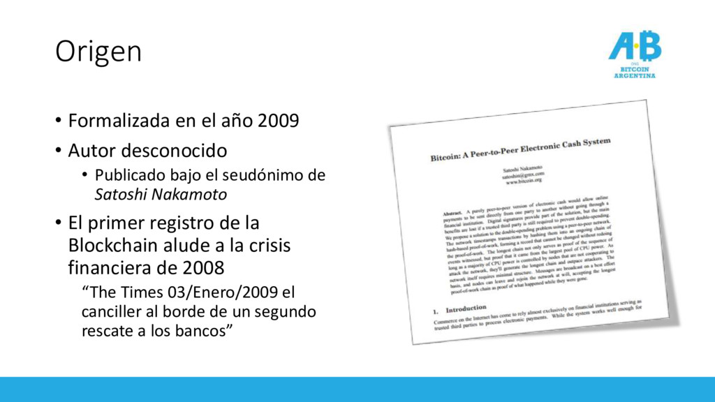 • Publicado bajo el seudónimo de Satoshi Nakamoto • El primer registro de la Blockchain alude a la crisis financiera de 2008 “The Times 03/Enero/2009 el canciller al borde de un segundo rescate a los bancos”