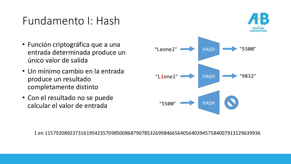 determinada produce un único valor de salida • Un mínimo cambio en la entrada produce un resultado completamente distinto • Con el resultado no se puede calcular el valor de entrada HASH “Leonel” “5500” HASH “Lionel” “9832” HASH “5500” 1 en 115792089237316195423570985008687907853269984665640564039457584007913129639936