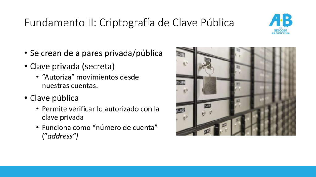 a pares privada/pública • Clave privada (secreta) • “Autoriza” movimientos desde nuestras cuentas. • Clave pública • Permite verificar lo autorizado con la clave privada • Funciona como “número de cuenta” (”address”)