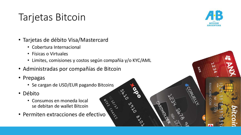 • Físicas o Virtuales • Limites, comisiones y costos según compañía y/o KYC/AML • Administradas por compañías de Bitcoin • Prepagas • Se cargan de USD/EUR pagando Bitcoins • Débito • Consumos en moneda local se debitan de wallet Bitcoin • Permiten extracciones de efectivo