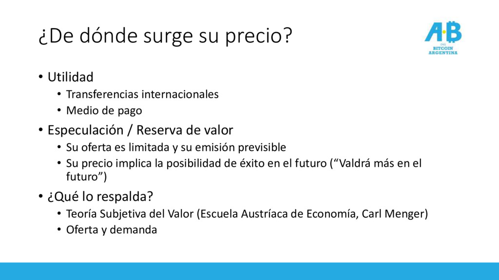 • Medio de pago • Especulación / Reserva de valor • Su oferta es limitada y su emisión previsible • Su precio implica la posibilidad de éxito en el futuro (“Valdrá más en el futuro”) • ¿Qué lo respalda? • Teoría Subjetiva del Valor (Escuela Austríaca de Economía, Carl Menger) • Oferta y demanda