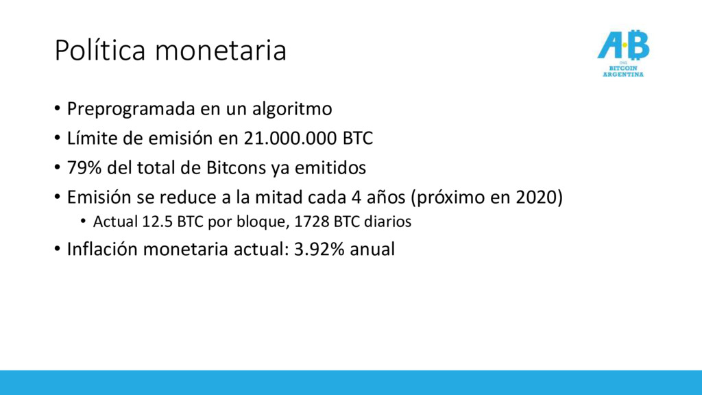 emisión en 21.000.000 BTC • 79% del total de Bitcons ya emitidos • Emisión se reduce a la mitad cada 4 años (próximo en 2020) • Actual 12.5 BTC por bloque, 1728 BTC diarios • Inflación monetaria actual: 3.92% anual