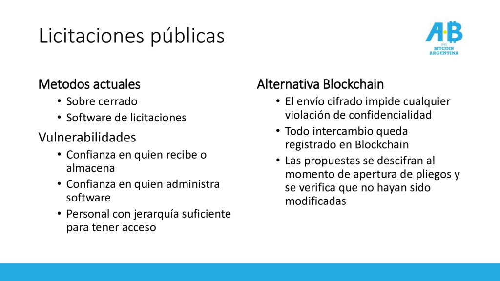 licitaciones Vulnerabilidades • Confianza en quien recibe o almacena • Confianza en quien administra software • Personal con jerarquía suficiente para tener acceso Alternativa Blockchain • El envío cifrado impide cualquier violación de confidencialidad • Todo intercambio queda registrado en Blockchain • Las propuestas se descifran al momento de apertura de pliegos y se verifica que no hayan sido modificadas