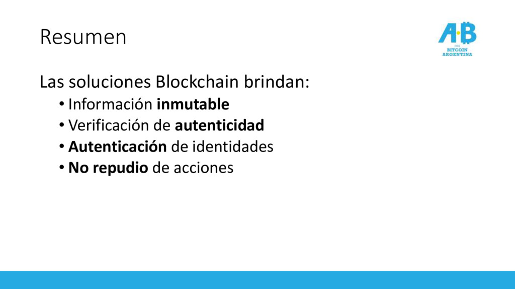 un libro contable público • Seguro: Cada “página del libro” (bloque) esta criptográficamente vinculada con la anterior. • Inmutable: Computacionalmente “imposible” de alterar • Distribuido: Cada nodo de la red tiene una copia de la Blockchain • Descentralizado: Permite generar consenso sin requerir autoridad central A -> B: 5 B -> D: 2 A -> D: 1 Génesis 3f52d0 B -> E: 1 F -> H: 4 14 af275b B -> E: 1 F -> H: 4 H -> C: 2 37 c0b481