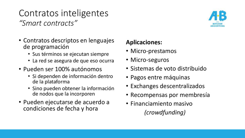 programación • Sus términos se ejecutan siempre • La red se asegura de que eso ocurra • Pueden ser 100% autónomos • Si dependen de información dentro de la plataforma • Sino pueden obtener la información de nodos que la incorporen • Pueden ejecutarse de acuerdo a condiciones de fecha y hora Aplicaciones: • Micro-prestamos • Micro-seguros • Sistemas de voto distribuido • Pagos entre máquinas • Exchanges descentralizados • Recompensas por membresía • Financiamiento masivo (crowdfunding)