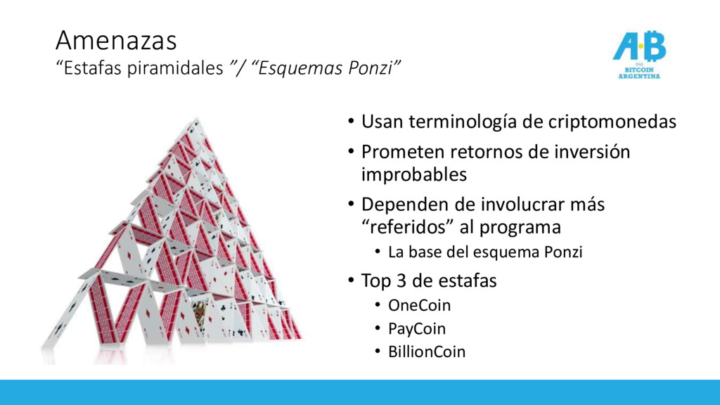 criptomonedas • Prometen retornos de inversión improbables • Dependen de involucrar más “referidos” al programa • La base del esquema Ponzi • Top 3 de estafas • OneCoin • PayCoin • BillionCoin