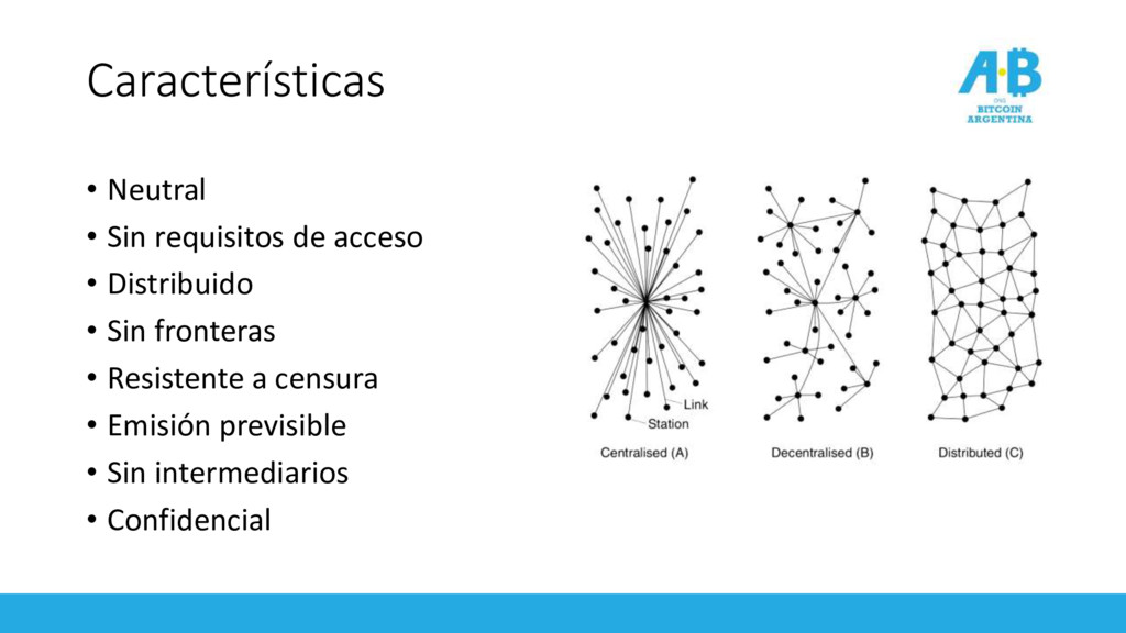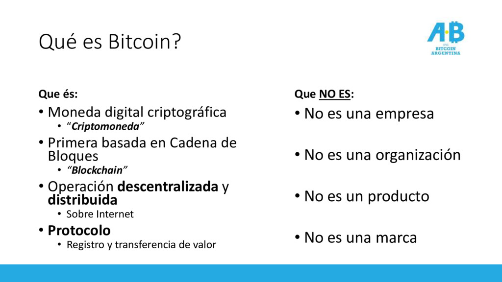 “Criptomoneda” • Primera basada en Cadena de Bloques • “Blockchain” • Operación descentralizada y distribuida • Sobre Internet • Protocolo • Registro y transferencia de valor Que NO ES: • No es una empresa • No es una organización • No es un producto • No es una marca