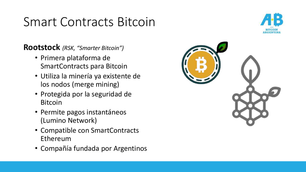 de SmartContracts para Bitcoin • Utiliza la minería ya existente de los nodos (merge mining) • Protegida por la seguridad de Bitcoin • Permite pagos instantáneos (Lumino Network) • Compatible con SmartContracts Ethereum • Compañía fundada por Argentinos