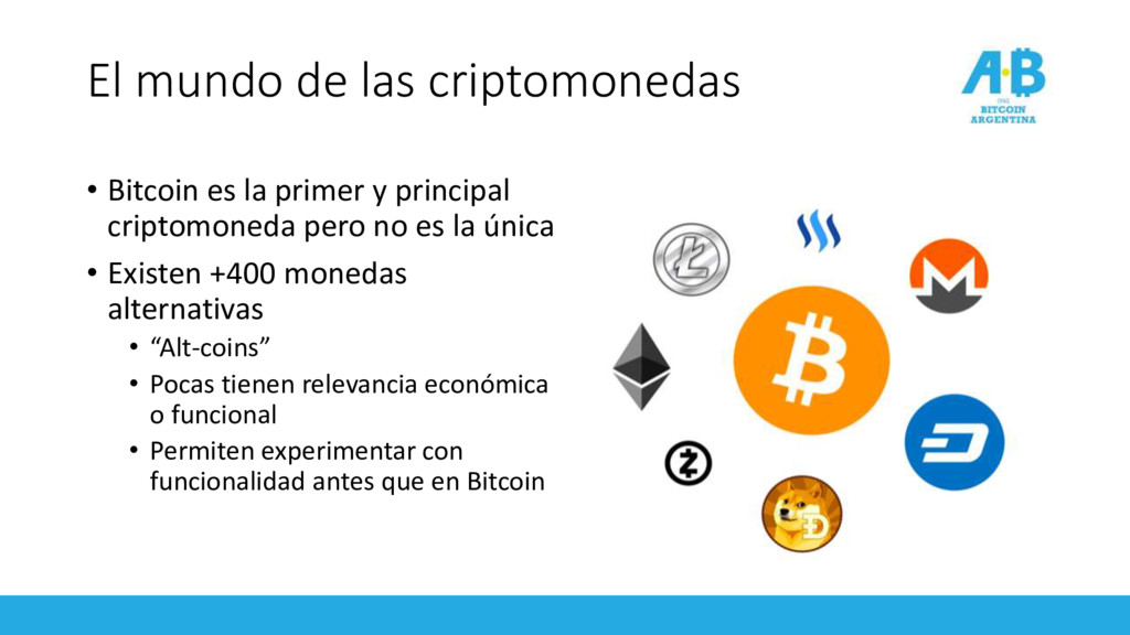 y principal criptomoneda pero no es la única • Existen +400 monedas alternativas • “Alt-coins” • Pocas tienen relevancia económica o funcional • Permiten experimentar con funcionalidad antes que en Bitcoin