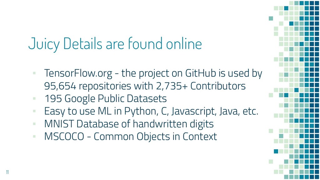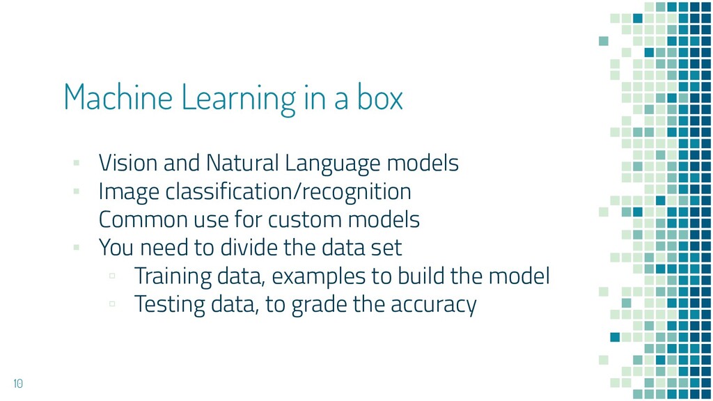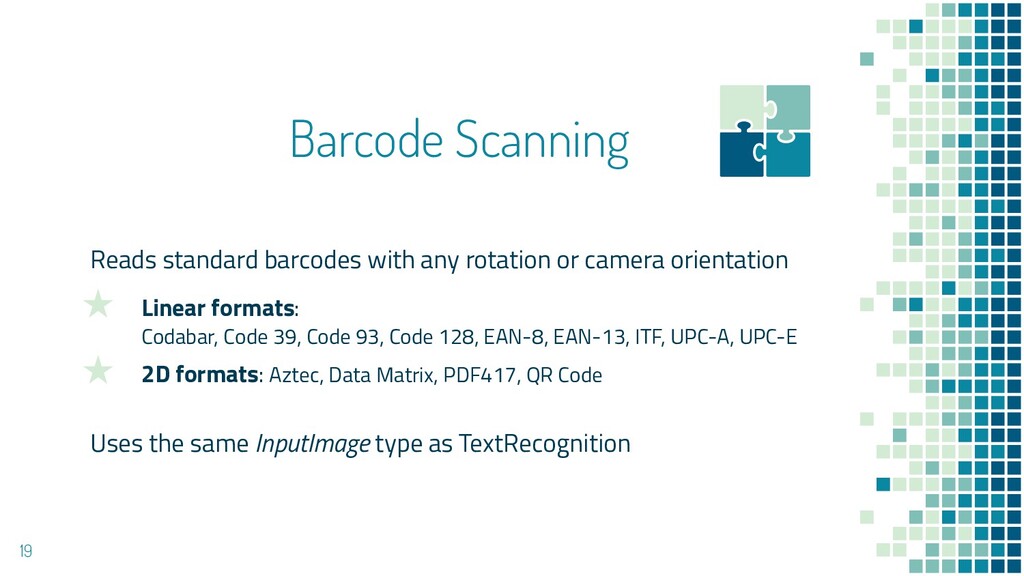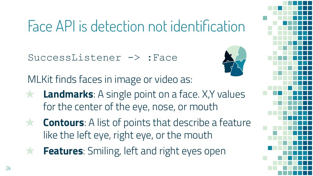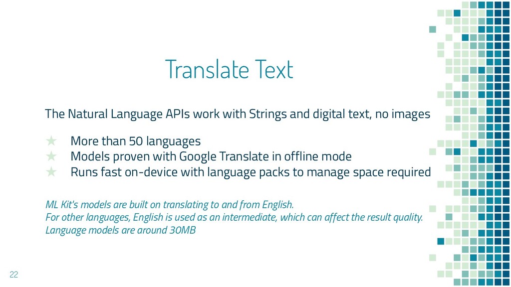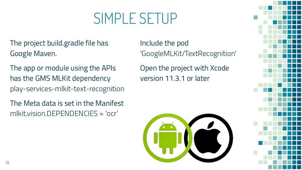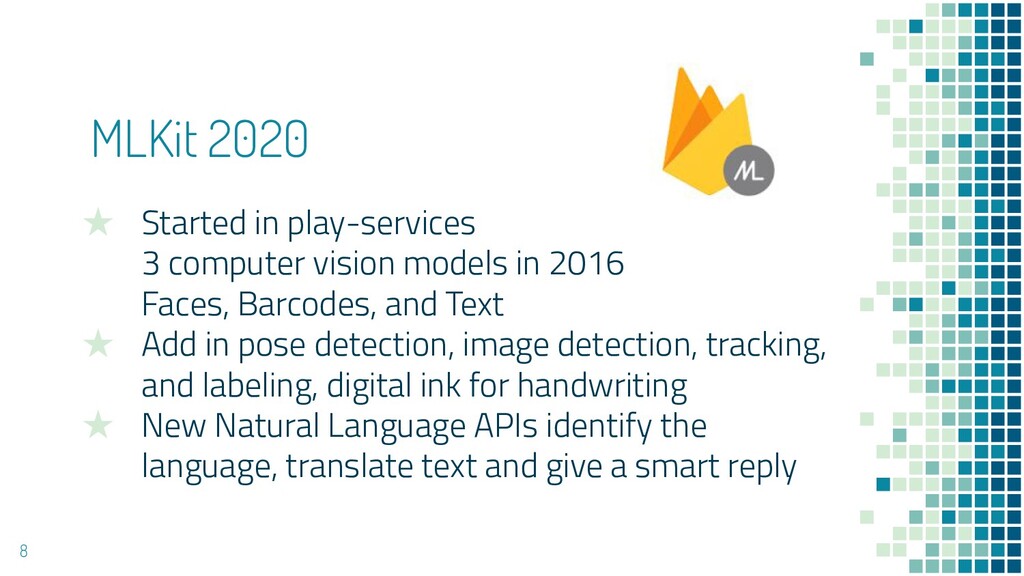 This talk will showcase the MLKit APIs from Google that can make iOS and Android apps more engaging and helpful with computer vision that is optimized to run on device. The APIs are built with the same Tensor Flow technology used in Google Translate and Google Photos. The example code for text recognition shows you how to code for any of the API models: text recognition, face detection, barcode scanning, image labeling, object detection, object tracking, smart reply, text translation, and language identification.