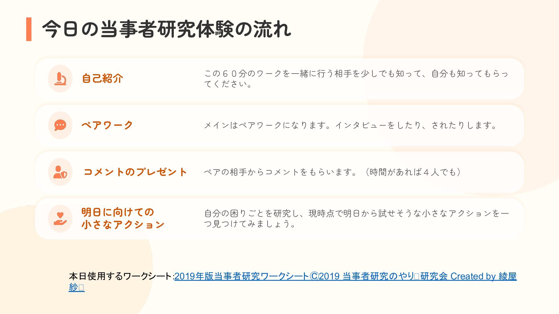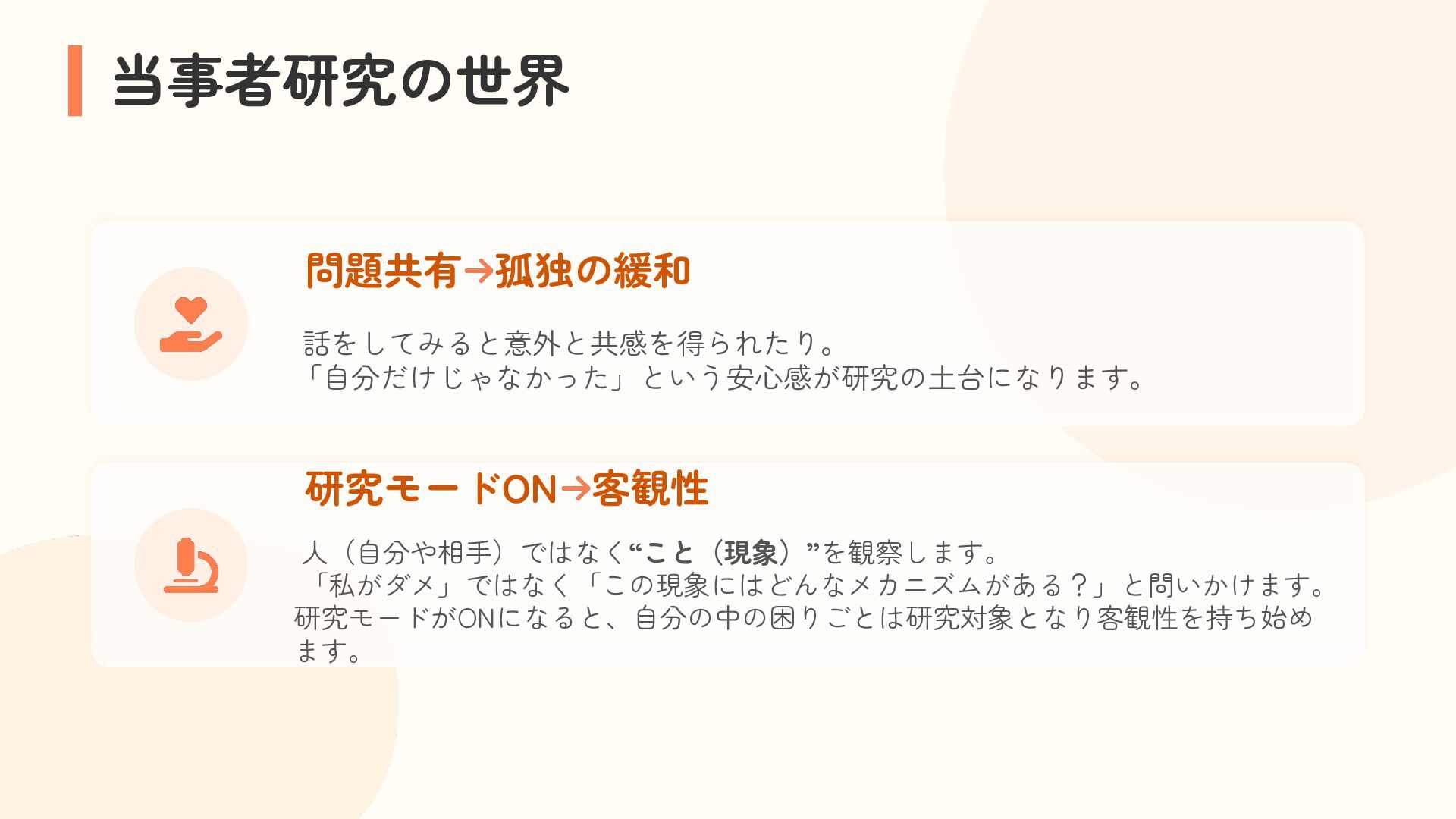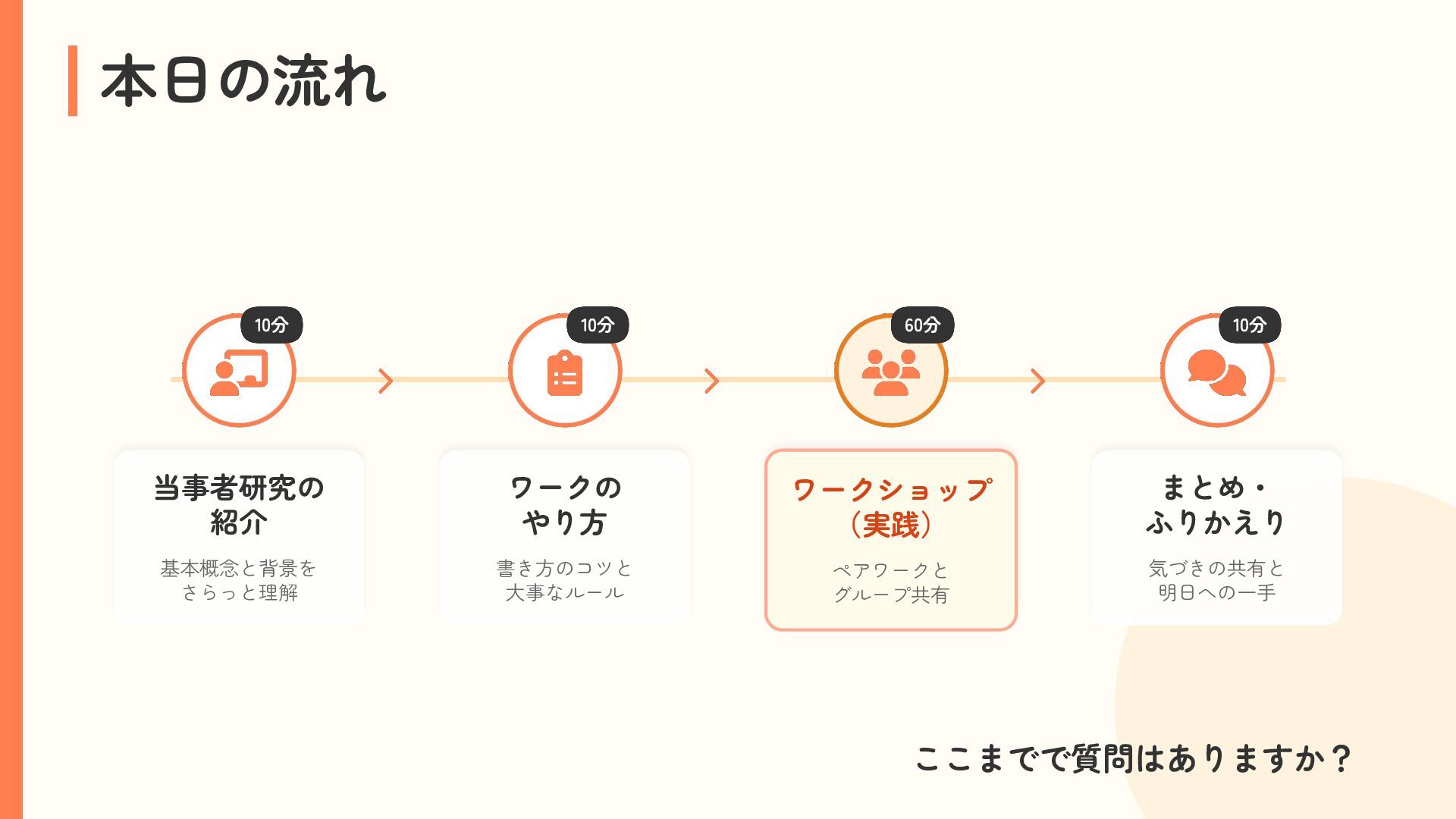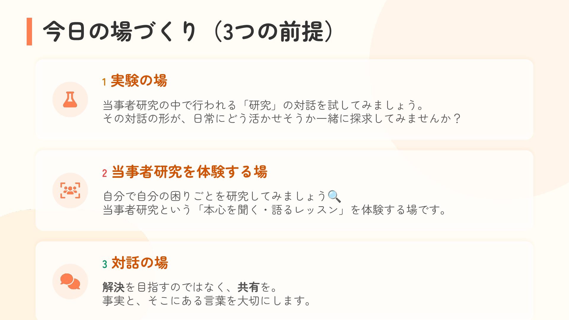 参加者は、自分の困りごとを整理しながら他者の経験と重ね合わせ、「研究モード」で捉え直す体験を行います。過去の失敗や経験を、個人の内省にとどめず「共有可能な経験」へと転換するプロセスを通じて、その場がもたらす効果を実感的に学びます。これら二つの体験を通して、アジャイルコミュニティにおける当事者研究の知恵の活用可能性を探ります。