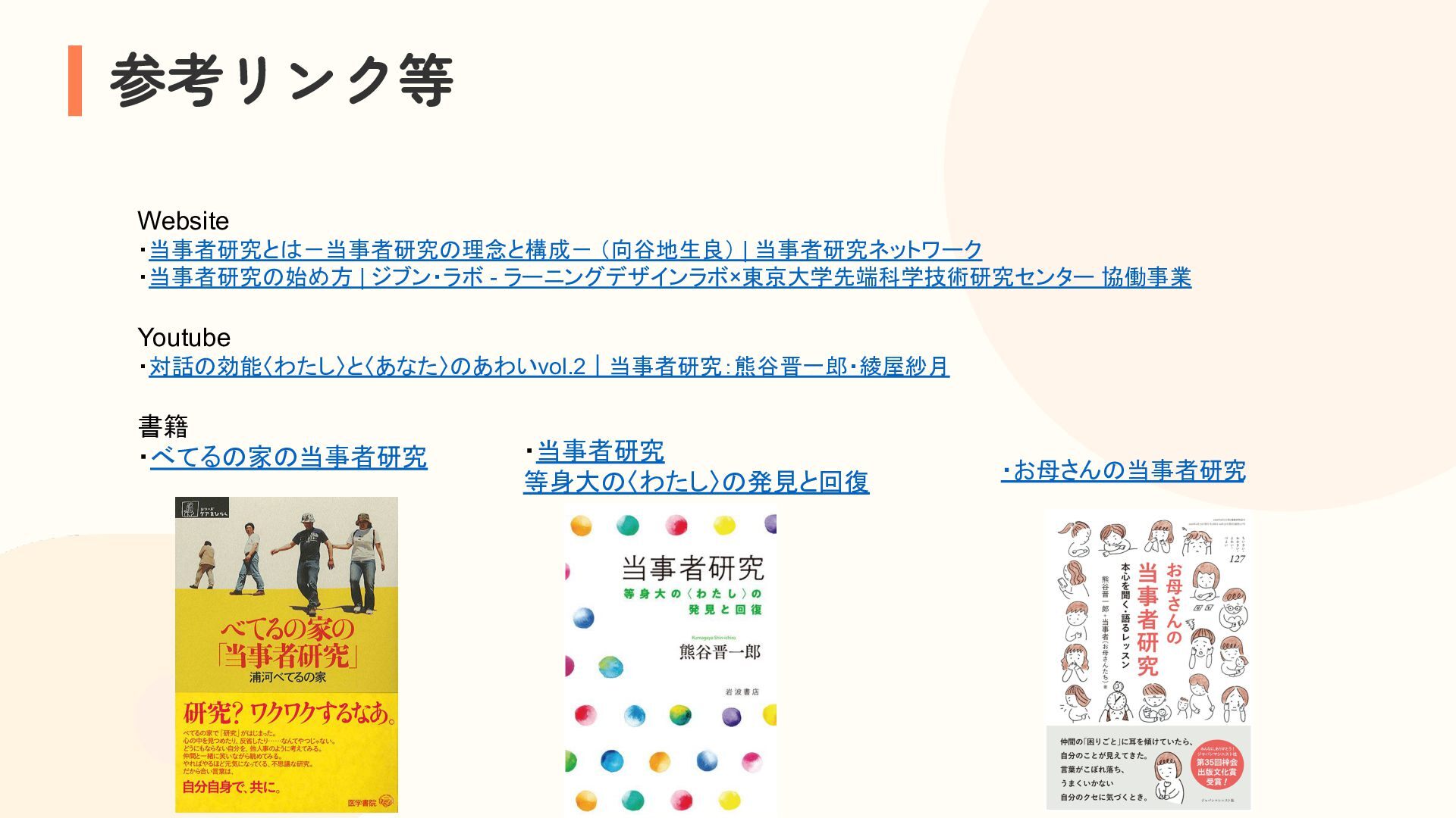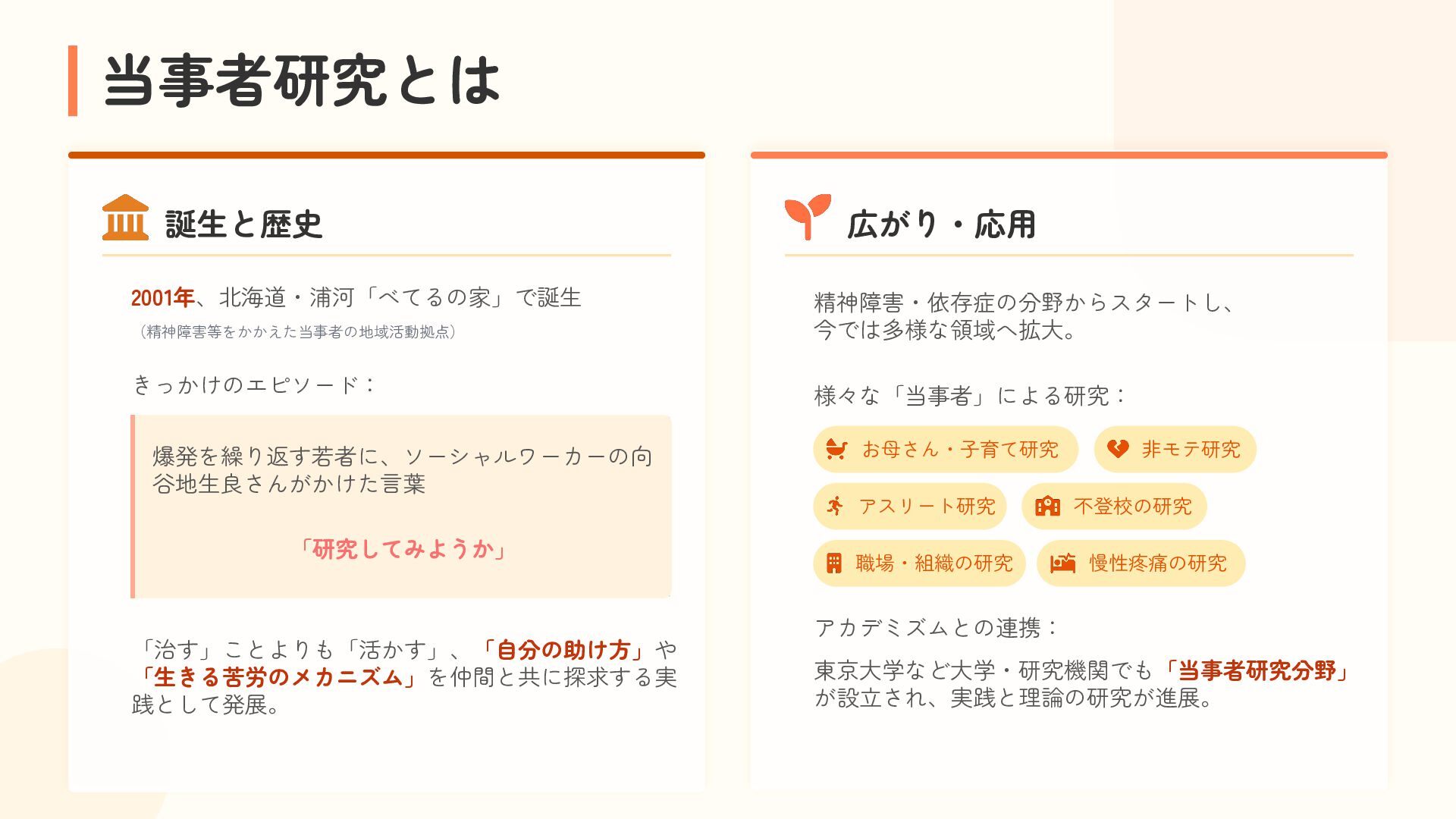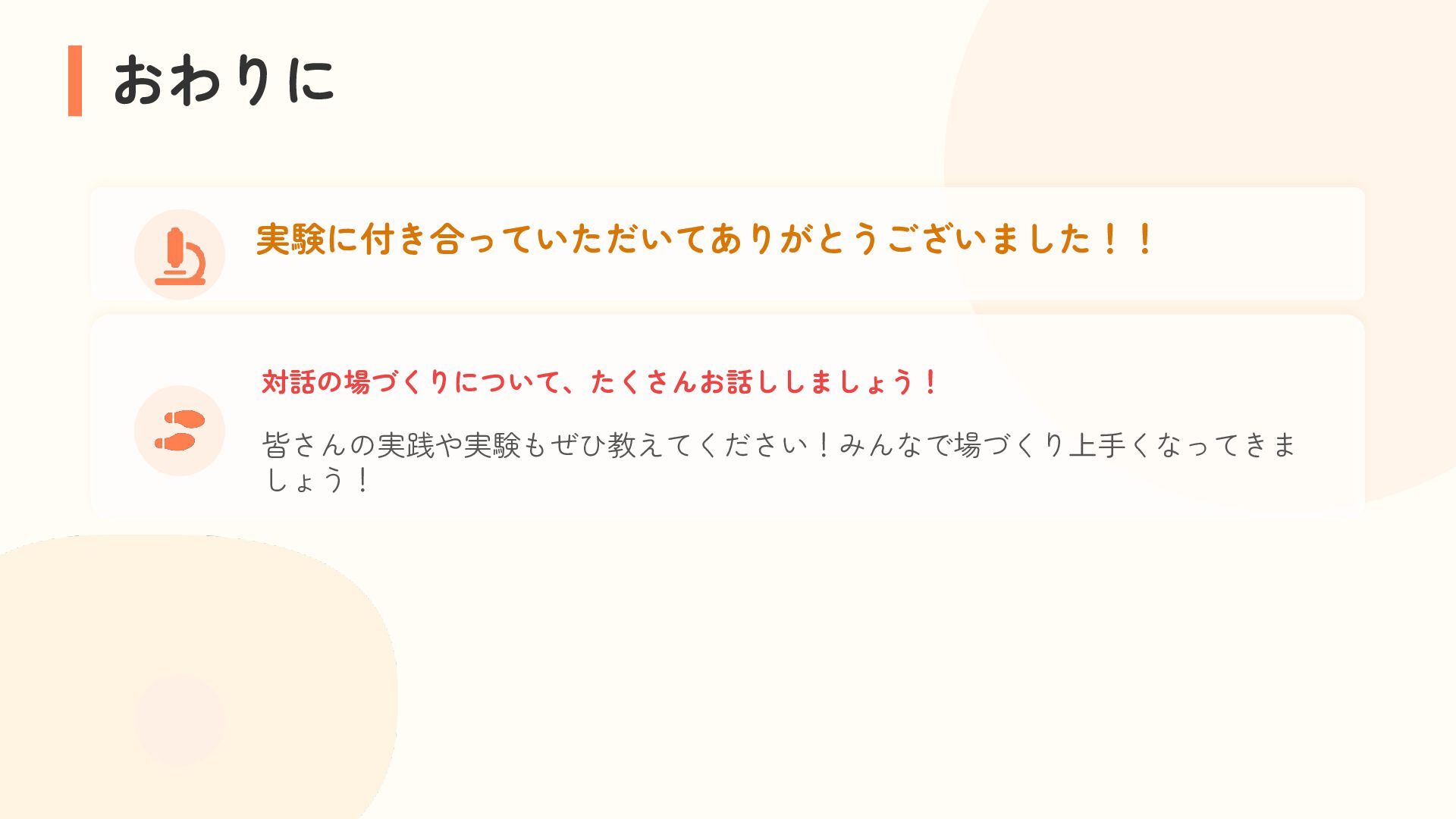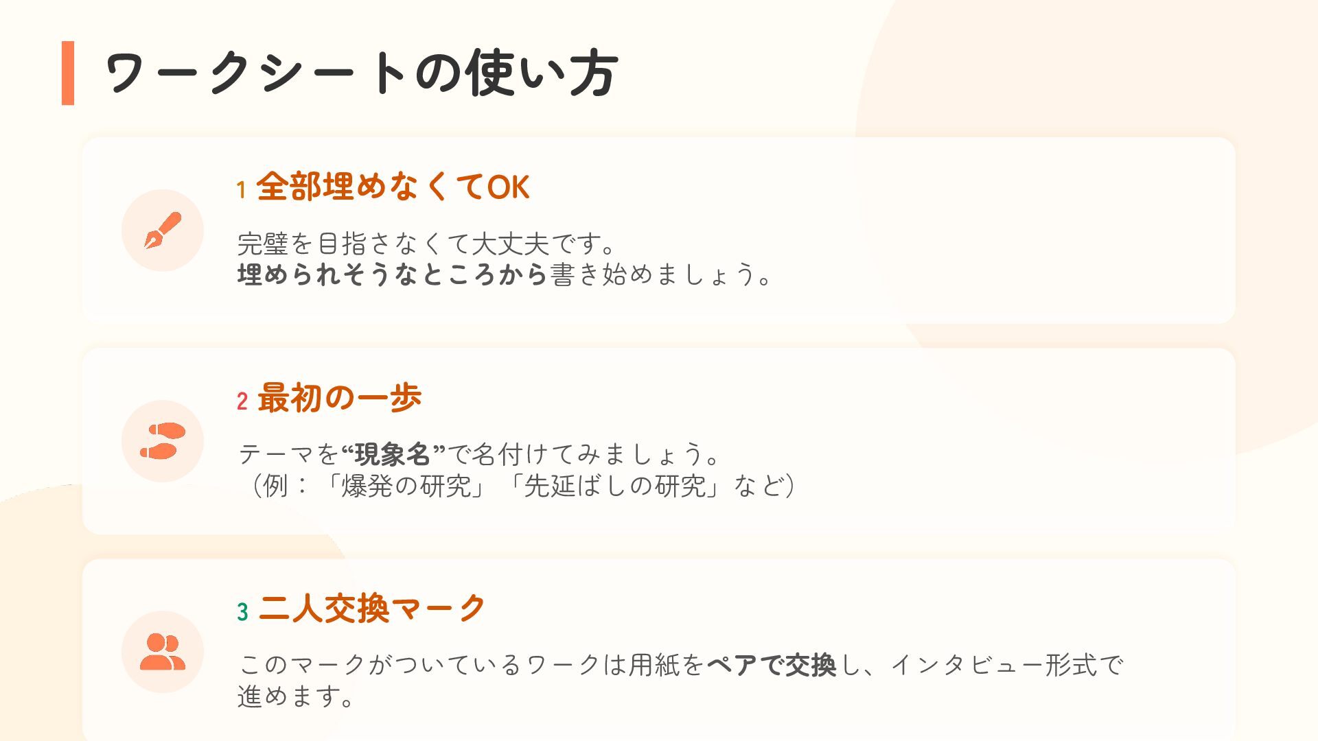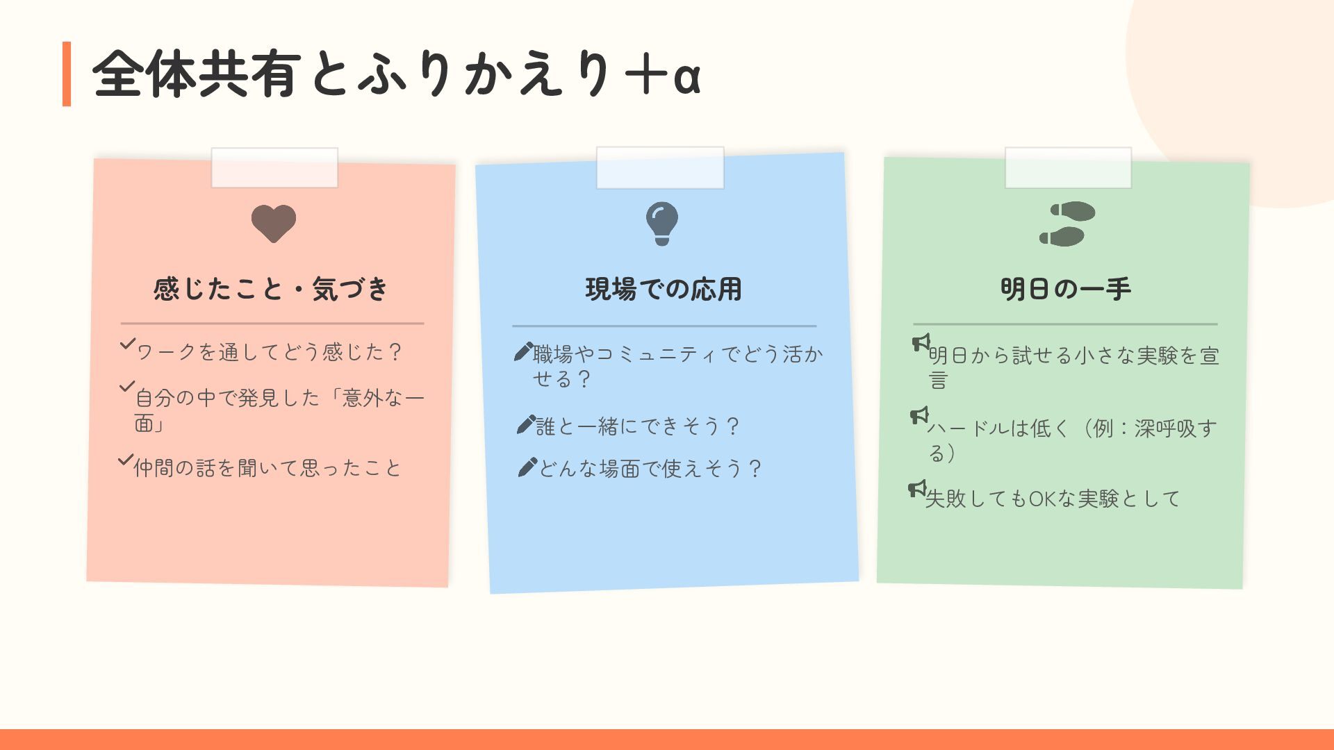 参加者は、自分の困りごとを整理しながら他者の経験と重ね合わせ、「研究モード」で捉え直す体験を行います。過去の失敗や経験を、個人の内省にとどめず「共有可能な経験」へと転換するプロセスを通じて、その場がもたらす効果を実感的に学びます。これら二つの体験を通して、アジャイルコミュニティにおける当事者研究の知恵の活用可能性を探ります。
