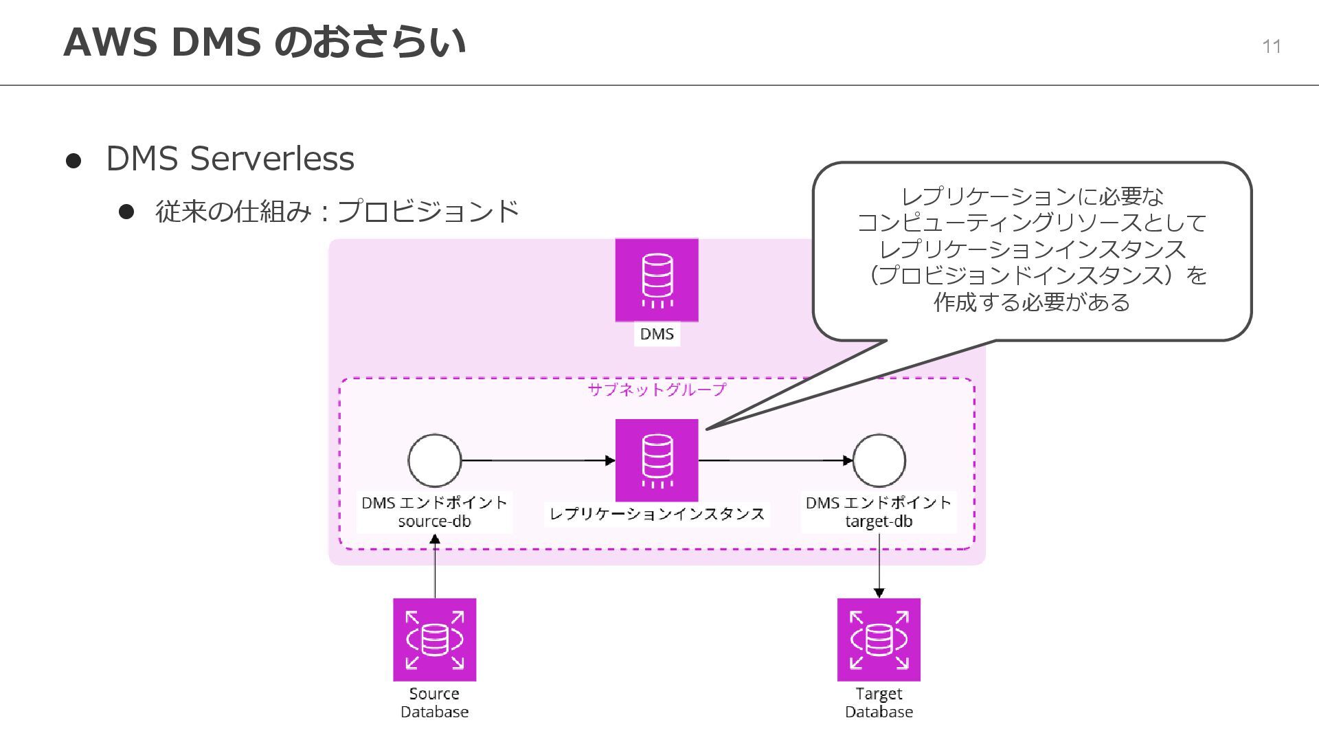 6. 11 ⚫ DMS Serverless ⚫ 従来の仕組み:プロビジョンド AWS DMS のおさらい レプリケーションに必要な