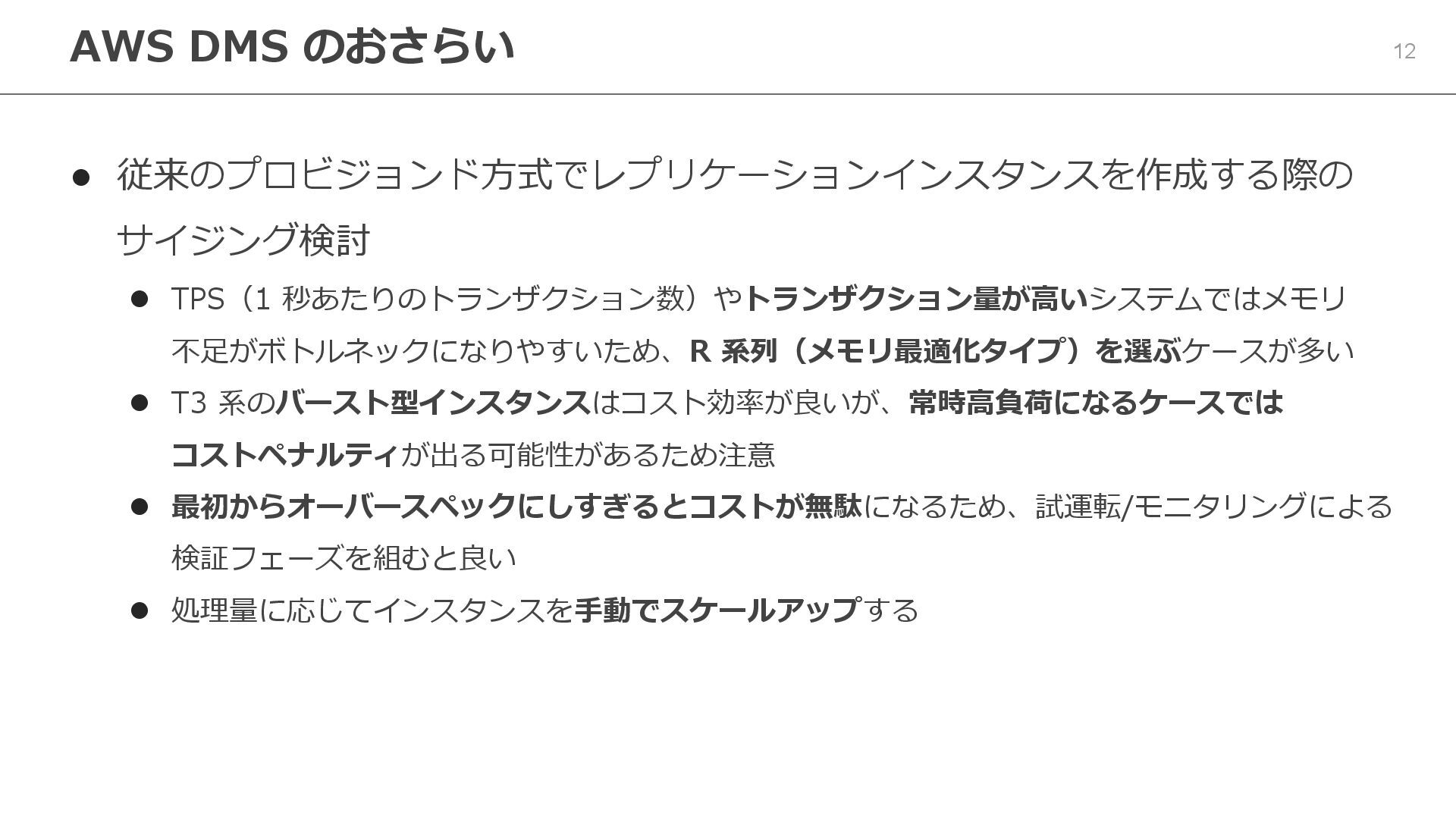 T3 系のバースト型インスタンスはコスト効率が良いが、常時高負荷になるケースでは コストペナルティが出る可能性があるため注意 ⚫ 最初からオーバースペックにしすぎるとコストが無駄になるため、試運転/モニタリングによる 検証フェーズを組むと良い ⚫ 処理量に応じてインスタンスを手動でスケールアップする AWS DMS のおさらい