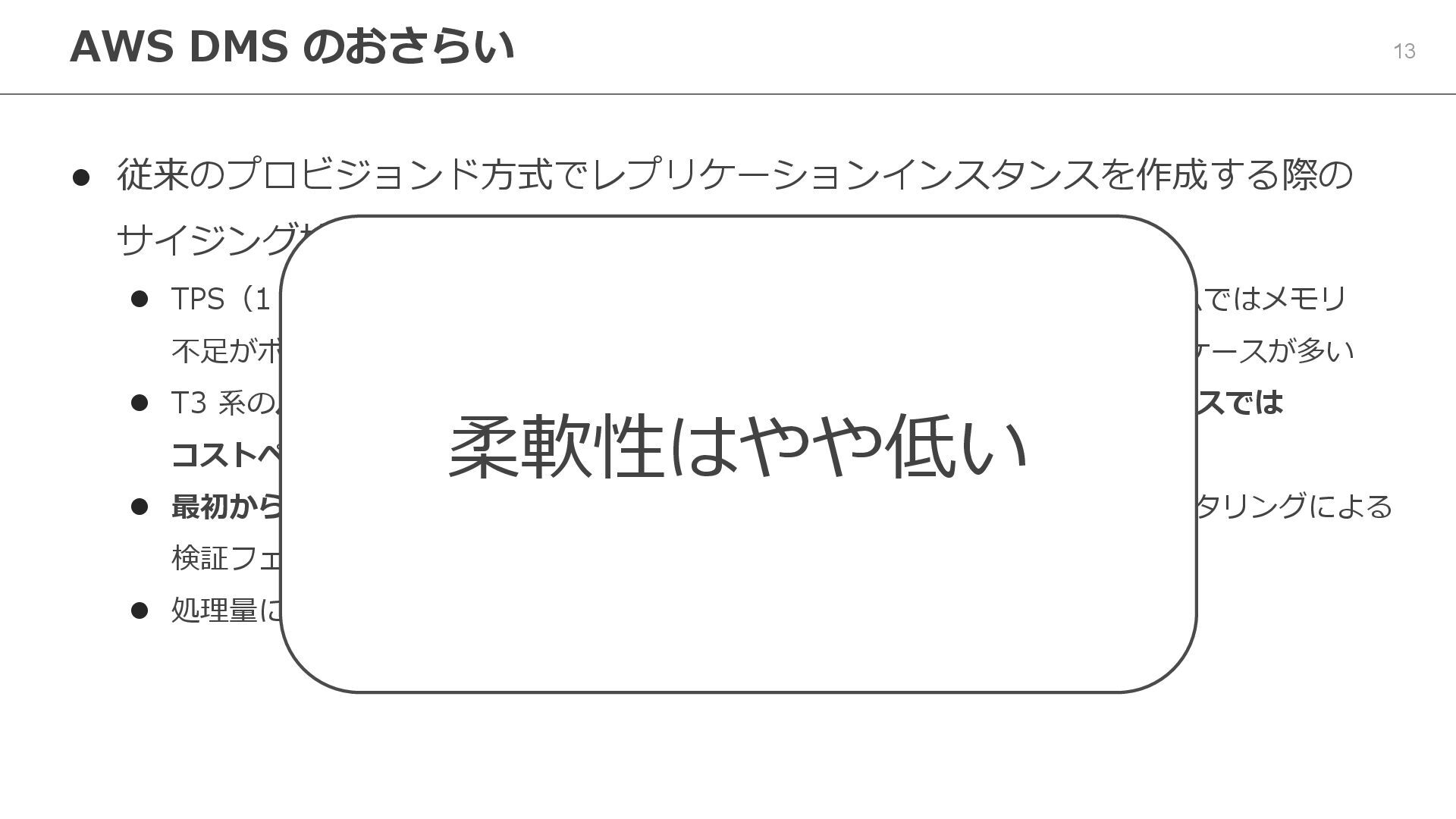 T3 系のバースト型インスタンスはコスト効率が良いが、常時高負荷になるケースでは コストペナルティが出る可能性があるため注意 ⚫ 最初からオーバースペックにしすぎるとコストが無駄になるため、試運転/モニタリングによる 検証フェーズを組むと良い ⚫ 処理量に応じてインスタンスを手動でスケールアップする AWS DMS のおさらい 柔軟性はやや低い