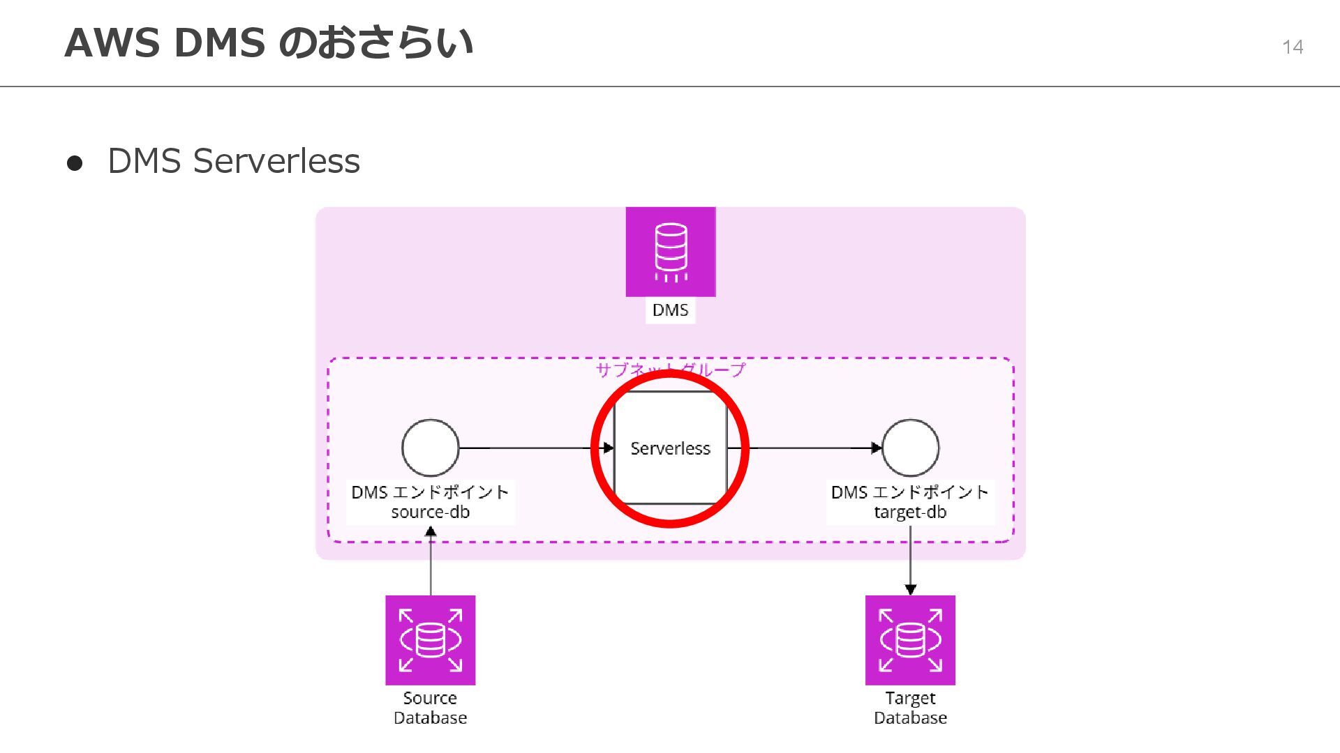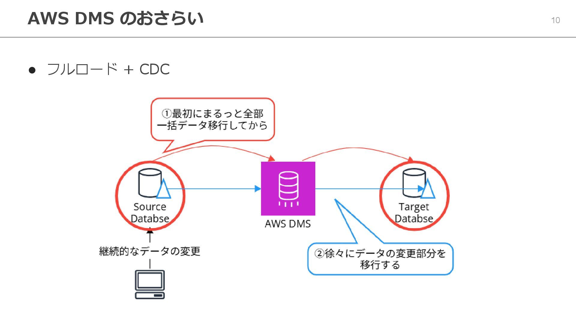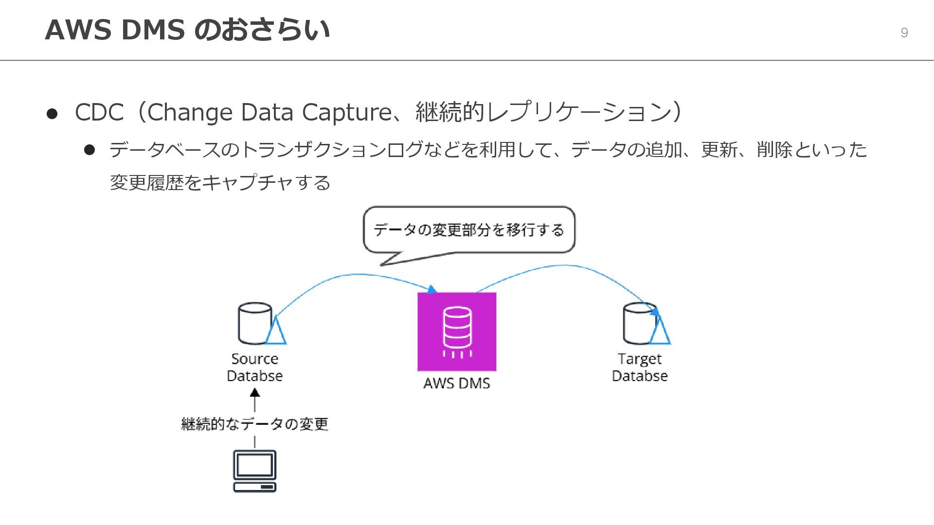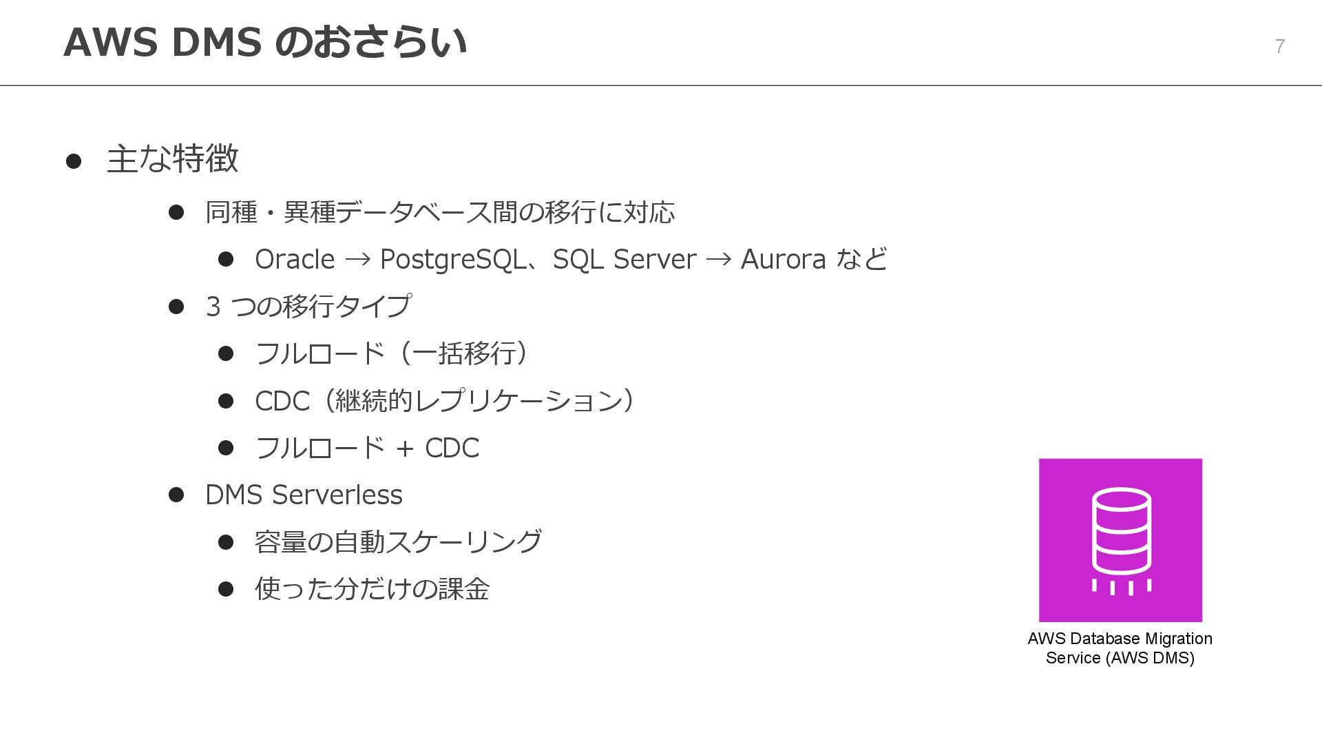 → Aurora など ⚫ 3 つの移行タイプ ⚫ フルロード(一括移行) ⚫ CDC(継続的レプリケーション) ⚫ フルロード + CDC ⚫ DMS Serverless ⚫ 容量の自動スケーリング ⚫ 使った分だけの課金 AWS DMS のおさらい AWS Database Migration Service (AWS DMS)