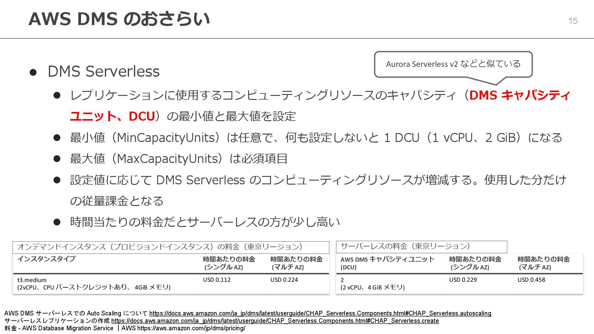 1 DCU(1 vCPU、2 GiB)になる ⚫ 最大値(MaxCapacityUnits)は必須項目 ⚫ 設定値に応じて DMS Serverless のコンピューティングリソースが増減する。使用した分だけ の従量課金となる ⚫ 時間当たりの料金だとサーバーレスの方が少し高い AWS DMS のおさらい Aurora Serverless v2 などと似ている AWS DMS サーバーレスでの Auto Scaling について https://docs.aws.amazon.com/ja_jp/dms/latest/userguide/CHAP_Serverless.Components.html#CHAP_Serverless.autoscaling サーバーレスレプリケーションの作成 https://docs.aws.amazon.com/ja_jp/dms/latest/userguide/CHAP_Serverless.Components.html#CHAP_Serverless.create 料金 - AWS Database Migration Service |AWS https://aws.amazon.com/jp/dms/pricing/ インスタンスタイプ 時間あたりの料金 (シングル AZ) 時間あたりの料金 (マルチ AZ) t3.medium (2vCPU、CPU バーストクレジットあり、 4GiB メモリ) USD 0.112 USD 0.224 AWS DMS キャパシティユニット (DCU) 時間あたりの料金 (シングル AZ) 時間あたりの料金 (マルチ AZ) 2 (2 vCPU、4 GiB メモリ) USD 0.229 USD 0.458 サーバーレスの料金(東京リージョン) オンデマンドインスタンス(プロビジョンドインスタンス)の料金(東京リージョン)