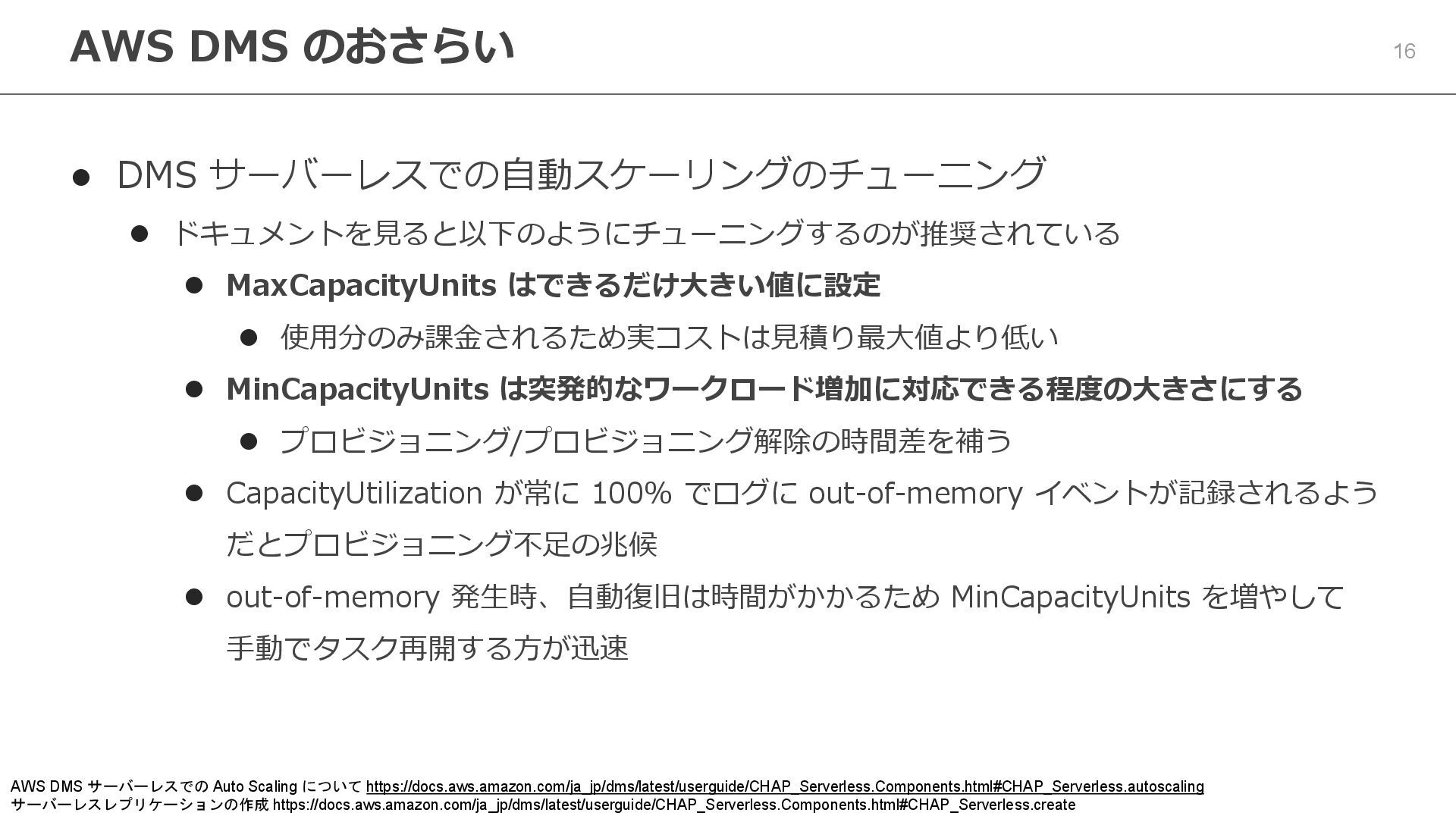 10. 16 ⚫ DMS サーバーレスでの自動スケーリングのチューニング ⚫ ドキュメントを見ると以下のようにチューニングするのが推奨されている ⚫ MaxCapacityUnits はできるだけ大きい値に設定 ⚫