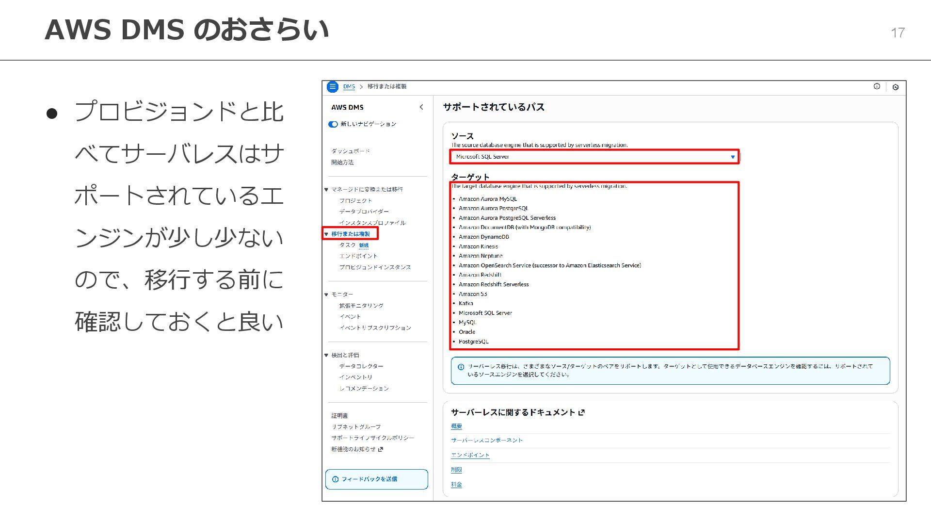 - YouTube https://www.youtube.com/watch?v=oopjz4vu9CY ⚫ AWS Database Migration Service ベストプラクティス - 計画編【AWS Black Belt】 - YouTube https://www.youtube.com/watch?v=teaU4tWraXE ⚫ AWS Database Migration Service ベストプラクティス - 実践編【AWS Black Belt】 - YouTube https://www.youtube.com/watch?v=2tE9uCGrk6M ⚫ AWS へのシステム移行の要点 (前編) | Amazon Web Services ブログ https://aws.amazon.com/jp/blogs/news/key-points-of-migrating-to-aws-part1/ ⚫ AWS へのシステム移行の要点 (後編) | Amazon Web Services ブログ https://aws.amazon.com/jp/blogs/news/key-points-of-migrating-to-aws-part2/ ⚫ データベース移行とは - データベース移行の説明 - AWS https://aws.amazon.com/jp/what-is/database-migration/ ⚫ RDS for SQL Server に SQL Server Management Studio(SSMS)でデータを挿入する | DevelopersIO https://dev.classmethod.jp/articles/rds-for-sql- server-ssms/ ⚫ AWS DMS で Amazon RDS for SQL Server のデータ移行を行う | DevelopersIO https://dev.classmethod.jp/articles/dms-rds-for-sql-server-data-migration/ ⚫ AWS DMS で Amazon RDS for SQL Server のデータ移行を行う〜 Serverless 編〜 | DevelopersIO https://dev.classmethod.jp/articles/dms-rds-for-sql- server-data-migration-serverless/ ⚫ AWS DMS のタスクモードをサーバーレスで試した際にフルロードが完了しなかったように見えた原因を CloudWatch Logs から調査する | DevelopersIO https://dev.classmethod.jp/articles/dms-serverless-full-load-troubleshooting-with-logs/ ⚫ AWS DMS のソースデータベースとターゲットデータベース間でデータが一致しない場合のトラブルシューティング | AWS re:Post https://repost.aws/ja/knowledge-center/dms-source-target-data-mismatch ⚫ AWS DMS を使用して DB エンジン間でデータを移行する | AWS re:Post https://repost.aws/ja/knowledge-center/migrate-db-dms ⚫ 異種混在データベースの移行 - AWS 規範ガイダンス https://docs.aws.amazon.com/ja_jp/prescriptive-guidance/latest/migration-oracle- database/heterogeneous-migration.html