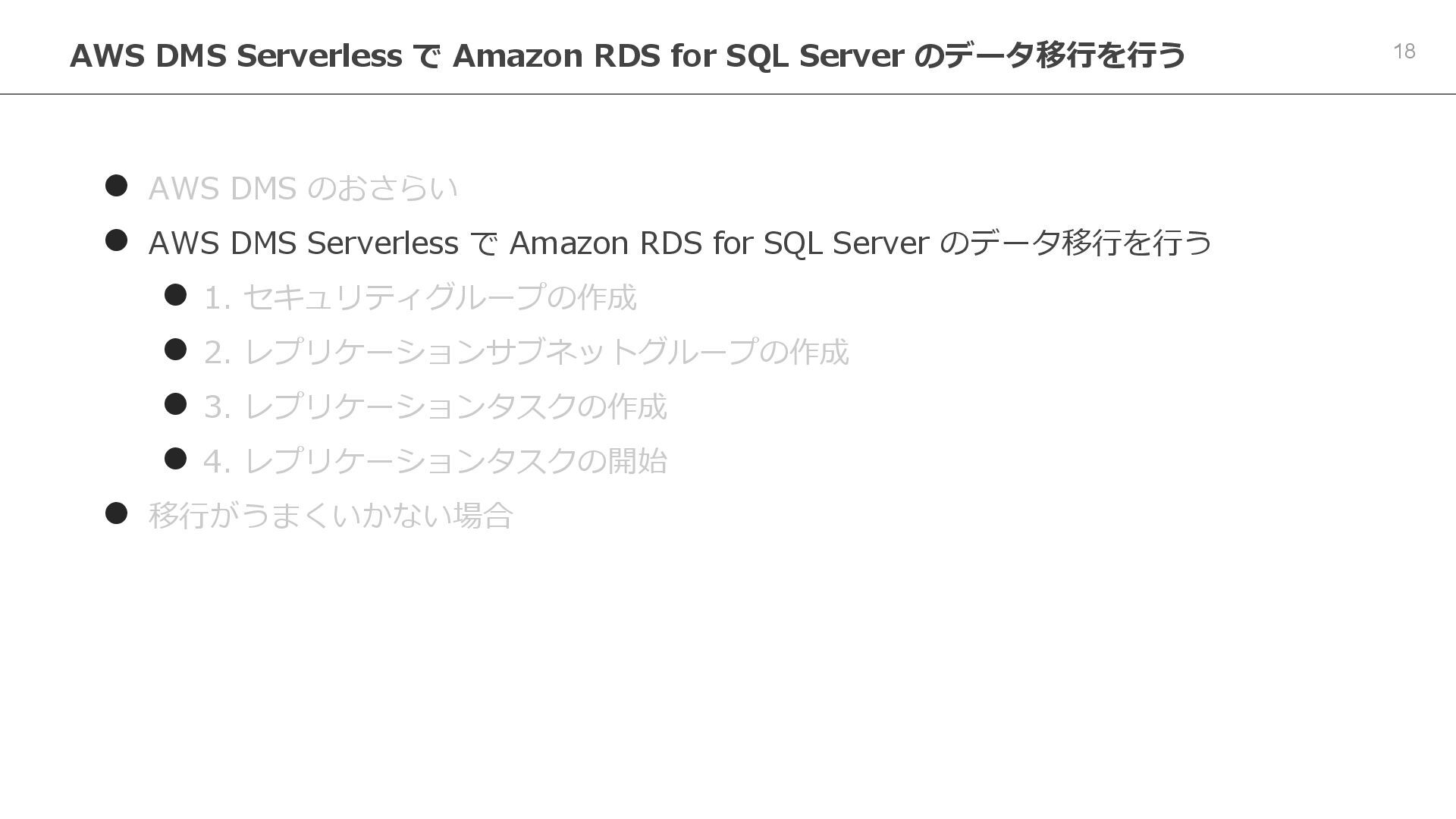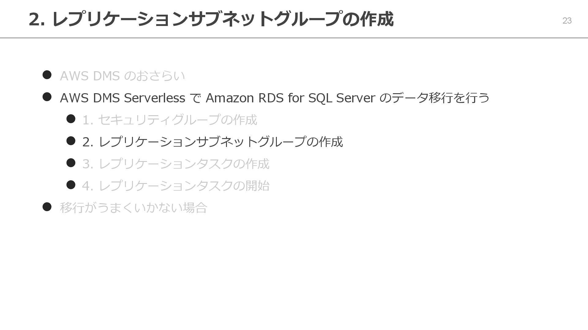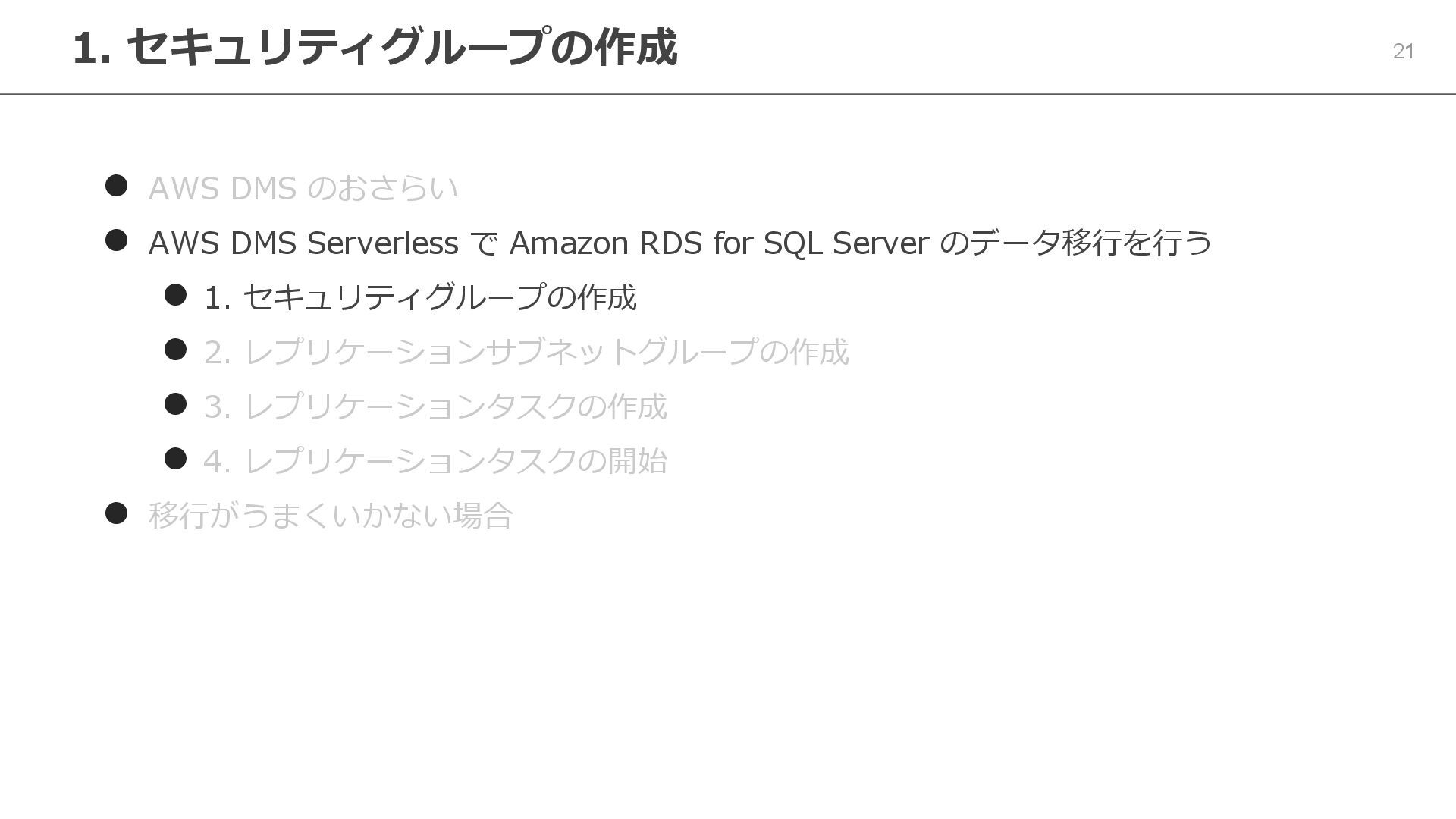 Serverless で Amazon RDS for SQL Server のデータ移行を行う ⚫ 1. セキュリティグループの作成 ⚫ 2. レプリケーションサブネットグループの作成 ⚫ 3. レプリケーションタスクの作成 ⚫ 4. レプリケーションタスクの開始 ⚫ 移行がうまくいかない場合