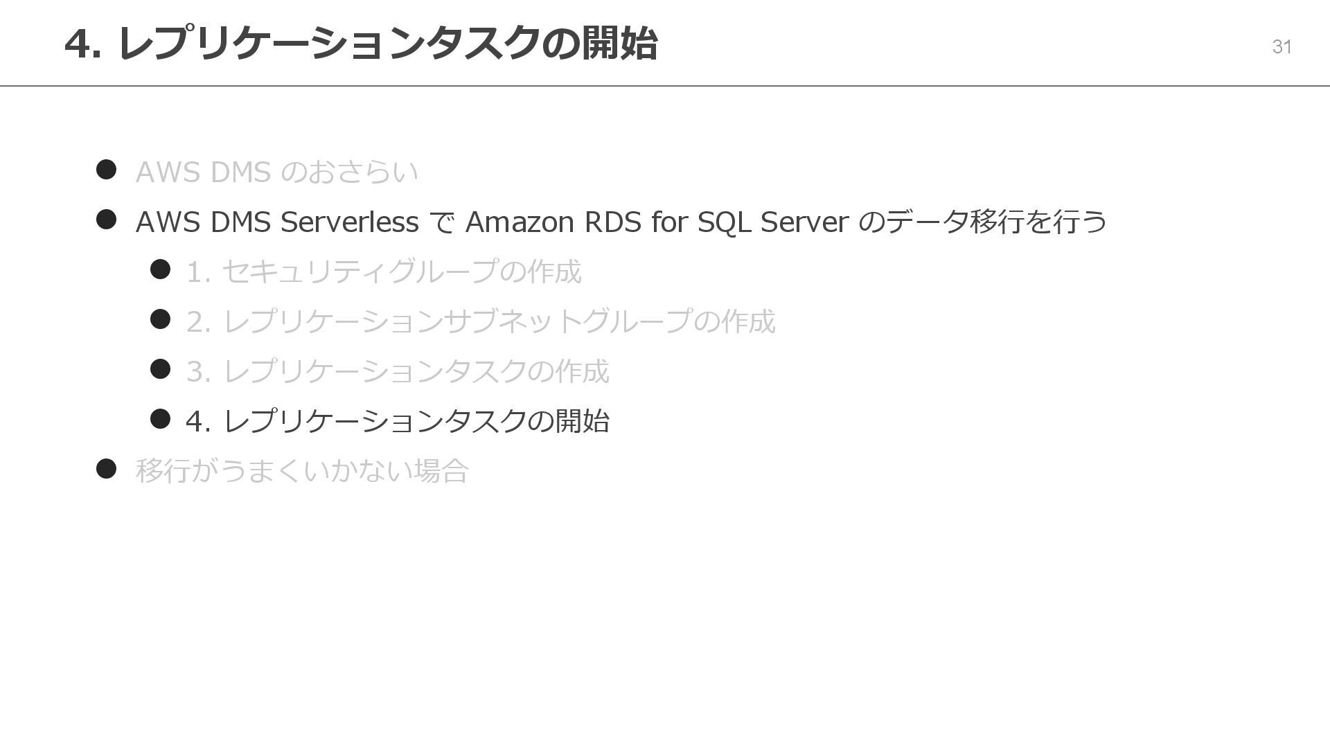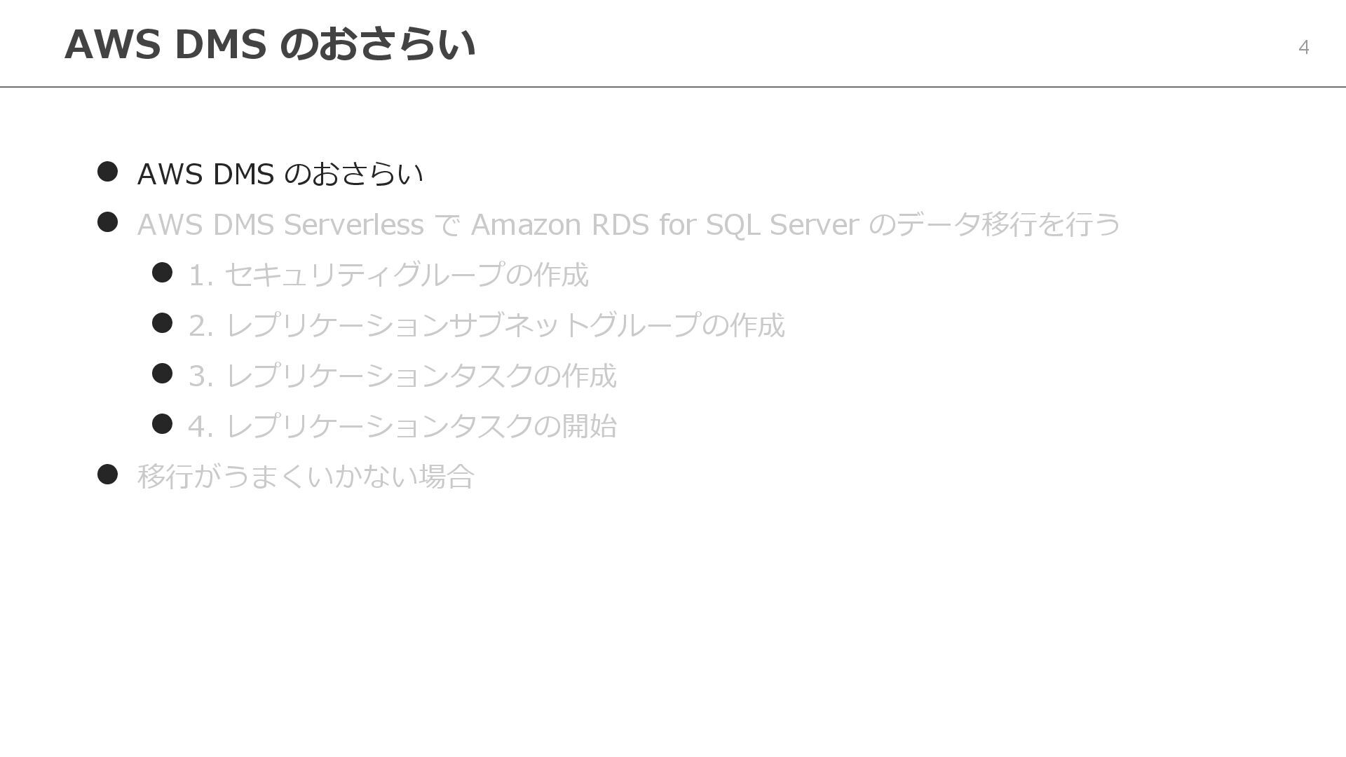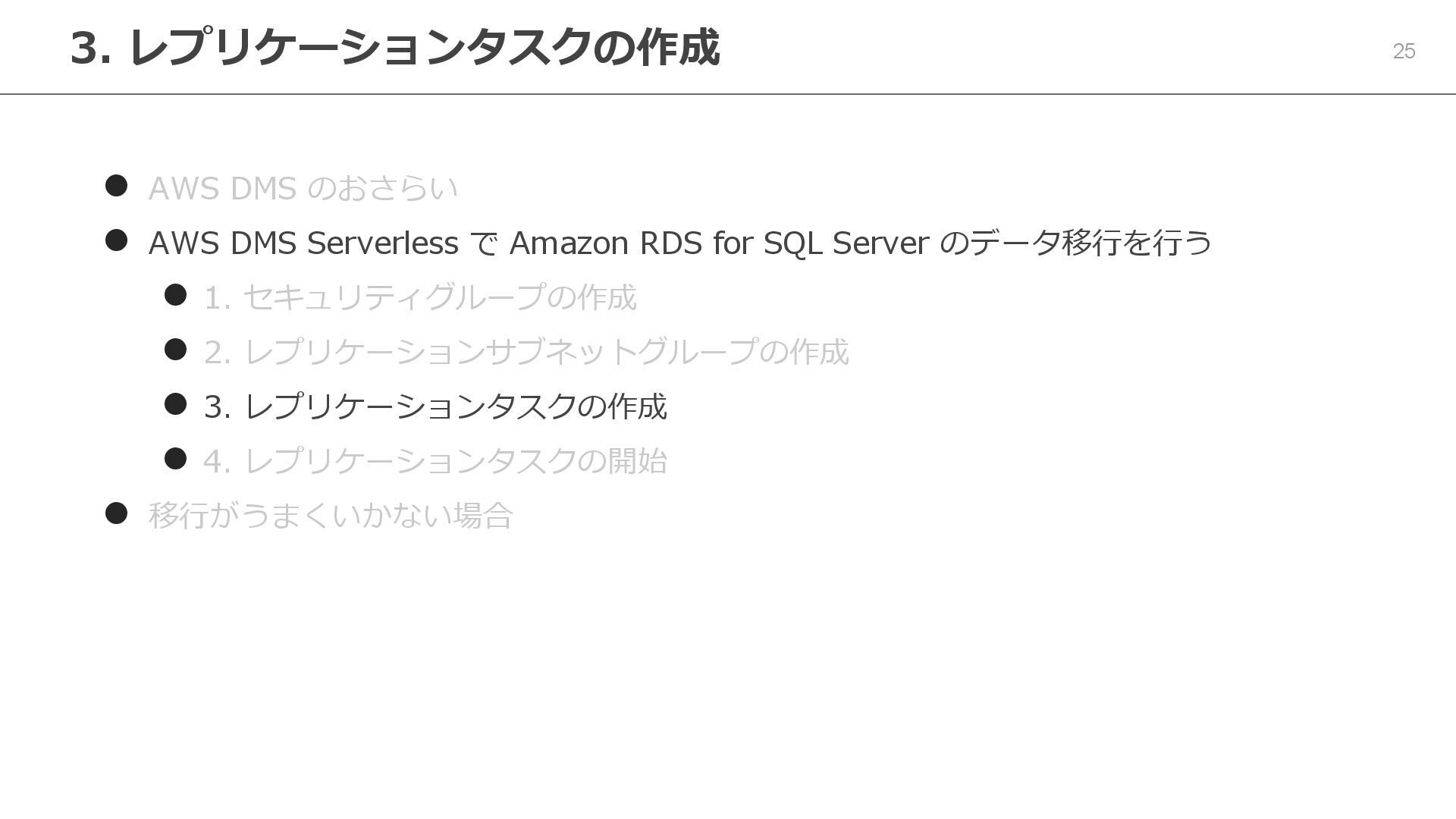 Serverless で Amazon RDS for SQL Server のデータ移行を行う ⚫ 1. セキュリティグループの作成 ⚫ 2. レプリケーションサブネットグループの作成 ⚫ 3. レプリケーションタスクの作成 ⚫ 4. レプリケーションタスクの開始 ⚫ 移行がうまくいかない場合