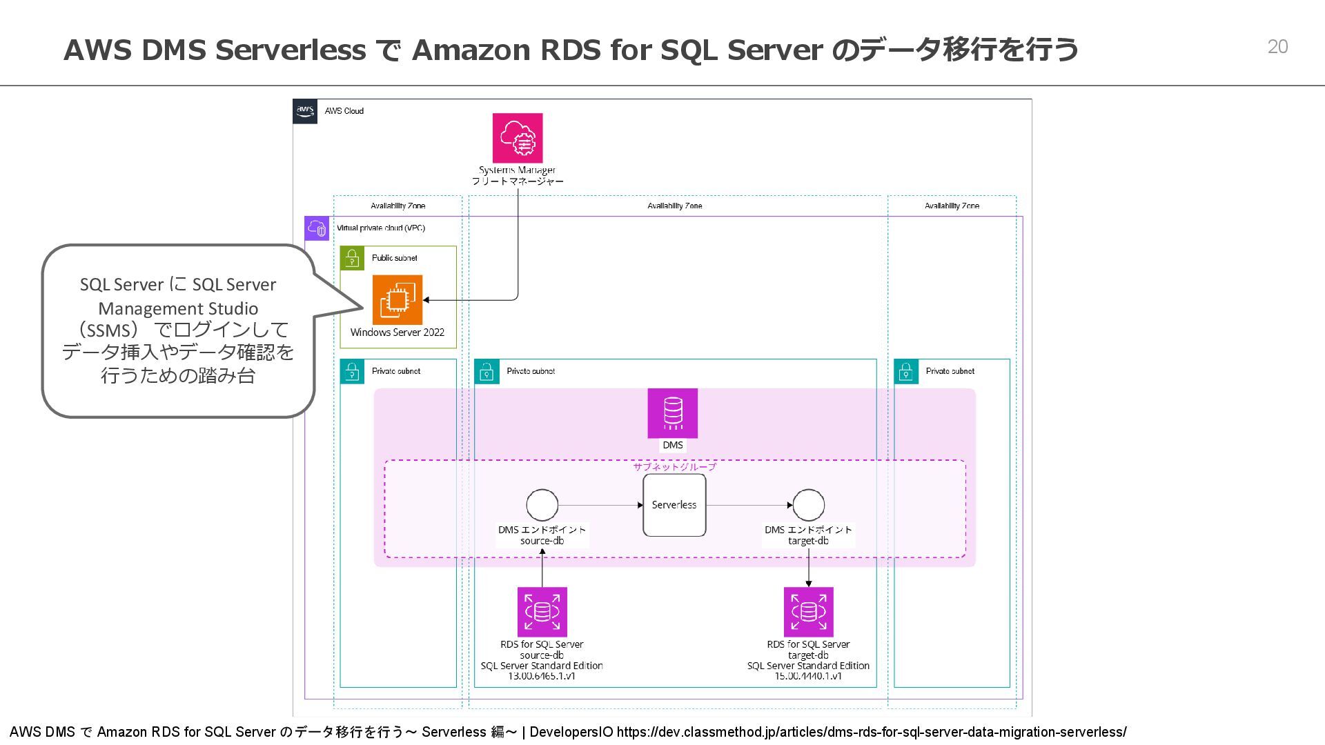 のデータ移行を行う AWS DMS で Amazon RDS for SQL Server のデータ移行を行う~ Serverless 編~ | DevelopersIO https://dev.classmethod.jp/articles/dms-rds-for-sql-server-data-migration-serverless/ SQL Server に SQL Server Management Studio (SSMS) でログインして データ挿入やデータ確認を 行うための踏み台
