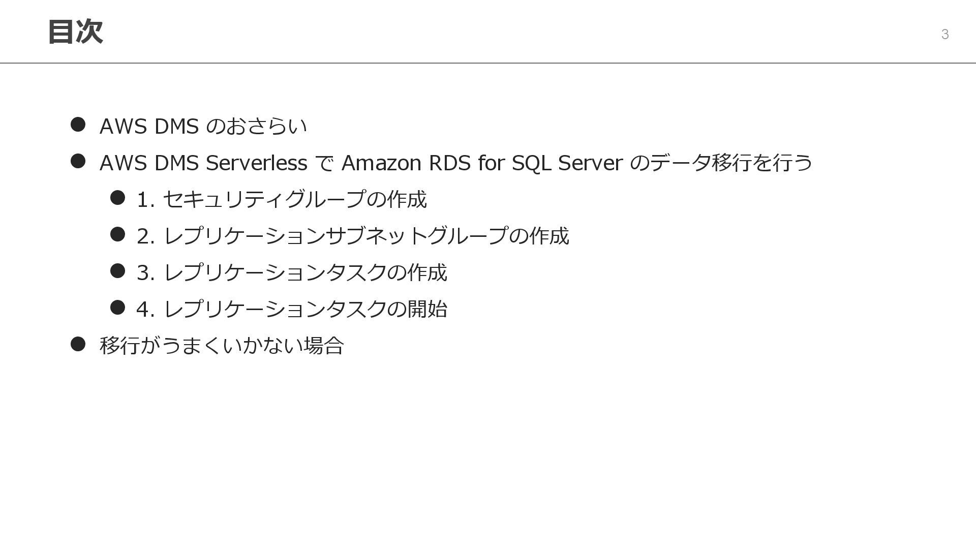 2. 目次 3 ⚫ AWS DMS のおさらい ⚫ AWS DMS Serverless