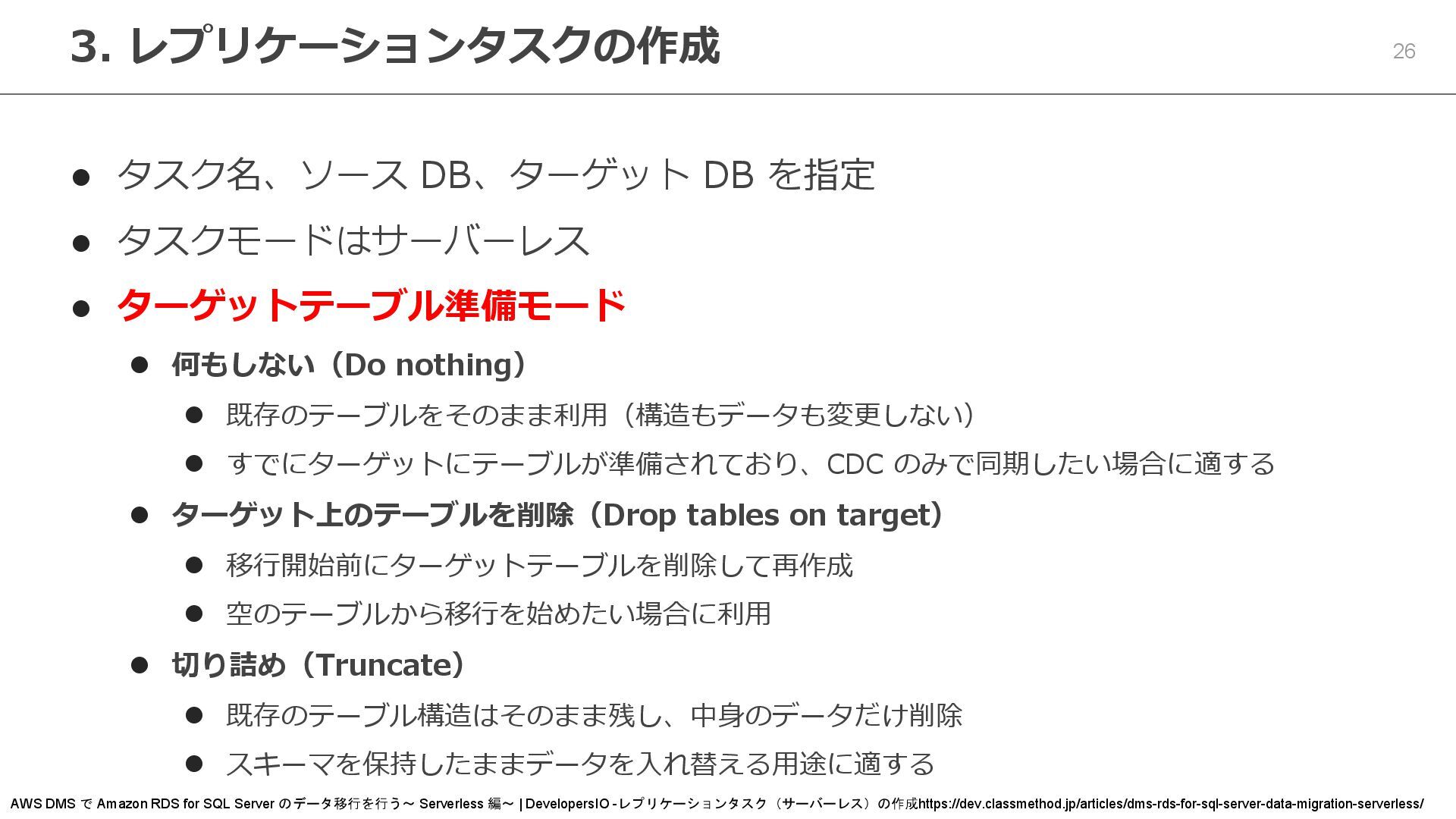 ⚫ 何もしない(Do nothing) ⚫ 既存のテーブルをそのまま利用(構造もデータも変更しない) ⚫ すでにターゲットにテーブルが準備されており、CDC のみで同期したい場合に適する ⚫ ターゲット上のテーブルを削除(Drop tables on target) ⚫ 移行開始前にターゲットテーブルを削除して再作成 ⚫ 空のテーブルから移行を始めたい場合に利用 ⚫ 切り詰め(Truncate) ⚫ 既存のテーブル構造はそのまま残し、中身のデータだけ削除 ⚫ スキーマを保持したままデータを入れ替える用途に適する 3. レプリケーションタスクの作成 AWS DMS で Amazon RDS for SQL Server のデータ移行を行う~ Serverless 編~ | DevelopersIO -レプリケーションタスク(サーバーレス)の作成https://dev.classmethod.jp/articles/dms-rds-for-sql-server-data-migration-serverless/