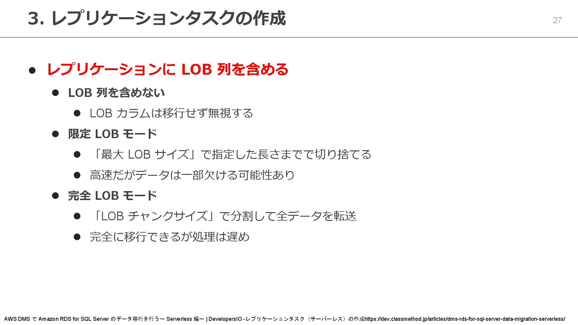 カラムは移行せず無視する ⚫ 限定 LOB モード ⚫ 「最大 LOB サイズ」で指定した長さまでで切り捨てる ⚫ 高速だがデータは一部欠ける可能性あり ⚫ 完全 LOB モード ⚫ 「LOB チャンクサイズ」で分割して全データを転送 ⚫ 完全に移行できるが処理は遅め 3. レプリケーションタスクの作成 AWS DMS で Amazon RDS for SQL Server のデータ移行を行う~ Serverless 編~ | DevelopersIO -レプリケーションタスク(サーバーレス)の作成https://dev.classmethod.jp/articles/dms-rds-for-sql-server-data-migration-serverless/