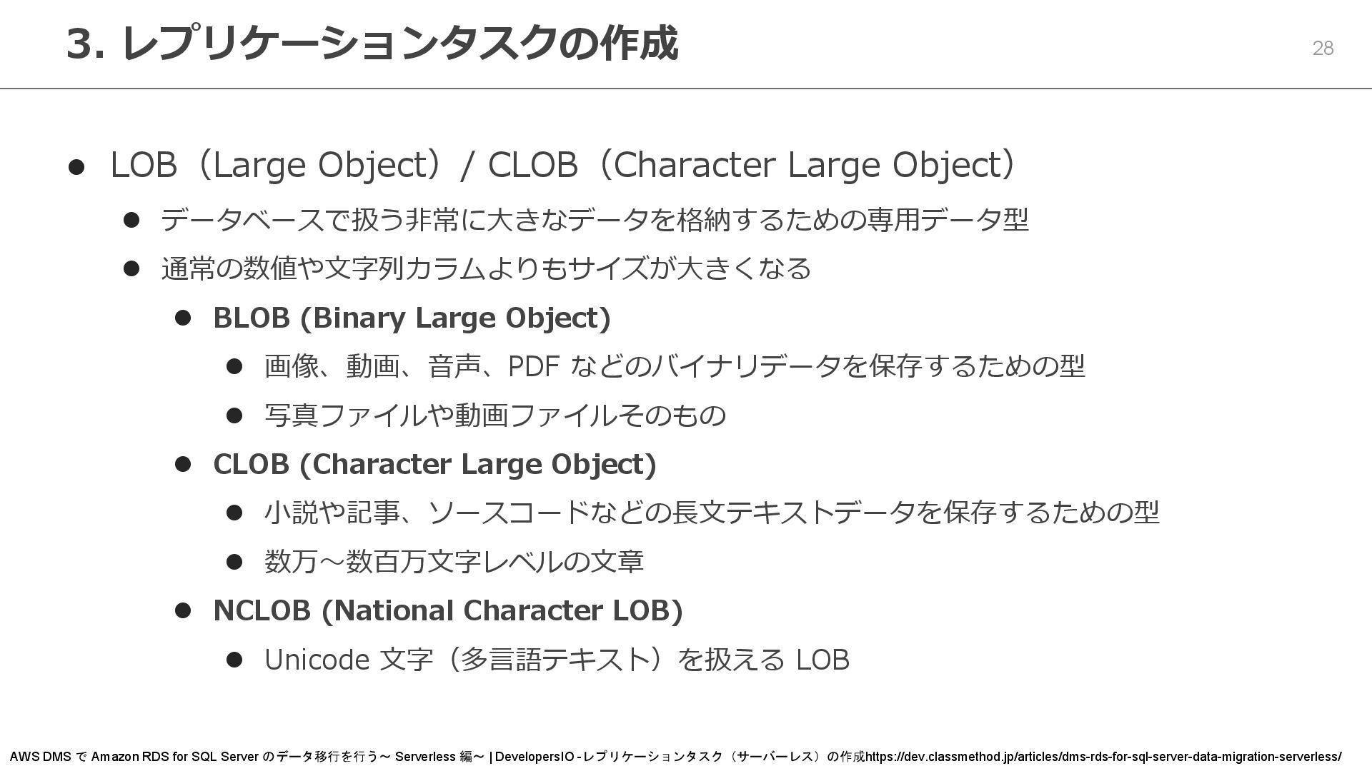 通常の数値や文字列カラムよりもサイズが大きくなる ⚫ BLOB (Binary Large Object) ⚫ 画像、動画、音声、PDF などのバイナリデータを保存するための型 ⚫ 写真ファイルや動画ファイルそのもの ⚫ CLOB (Character Large Object) ⚫ 小説や記事、ソースコードなどの長文テキストデータを保存するための型 ⚫ 数万〜数百万文字レベルの文章 ⚫ NCLOB (National Character LOB) ⚫ Unicode 文字(多言語テキスト)を扱える LOB 3. レプリケーションタスクの作成 AWS DMS で Amazon RDS for SQL Server のデータ移行を行う~ Serverless 編~ | DevelopersIO -レプリケーションタスク(サーバーレス)の作成https://dev.classmethod.jp/articles/dms-rds-for-sql-server-data-migration-serverless/