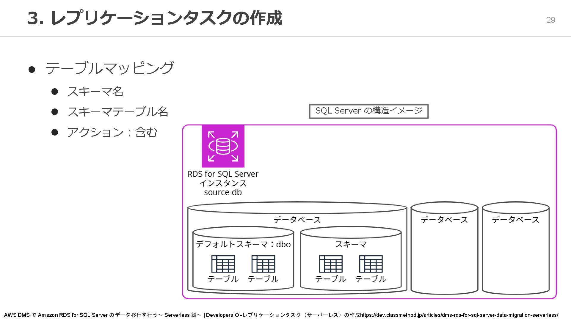レプリケーションタスクの作成 AWS DMS で Amazon RDS for SQL Server のデータ移行を行う~ Serverless 編~ | DevelopersIO -レプリケーションタスク(サーバーレス)の作成https://dev.classmethod.jp/articles/dms-rds-for-sql-server-data-migration-serverless/ SQL Server の構造イメージ