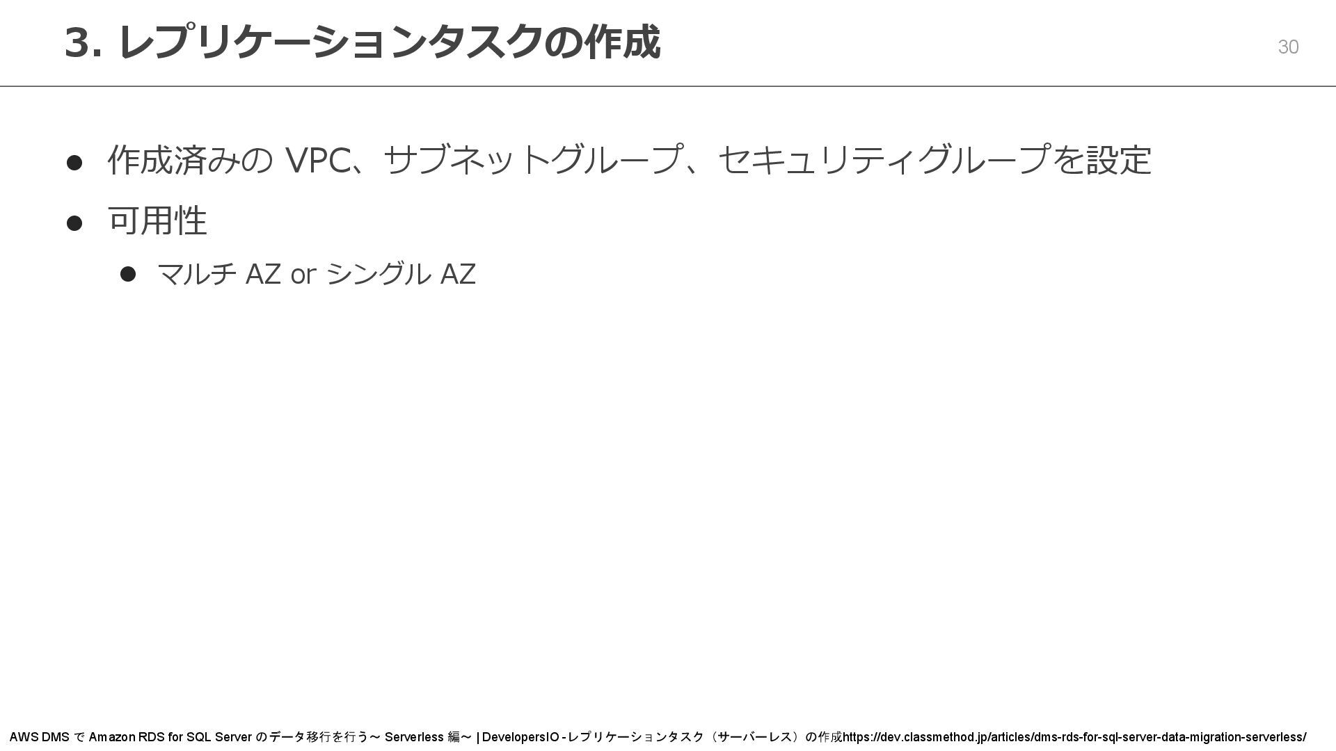 シングル AZ 3. レプリケーションタスクの作成 AWS DMS で Amazon RDS for SQL Server のデータ移行を行う~ Serverless 編~ | DevelopersIO -レプリケーションタスク(サーバーレス)の作成https://dev.classmethod.jp/articles/dms-rds-for-sql-server-data-migration-serverless/