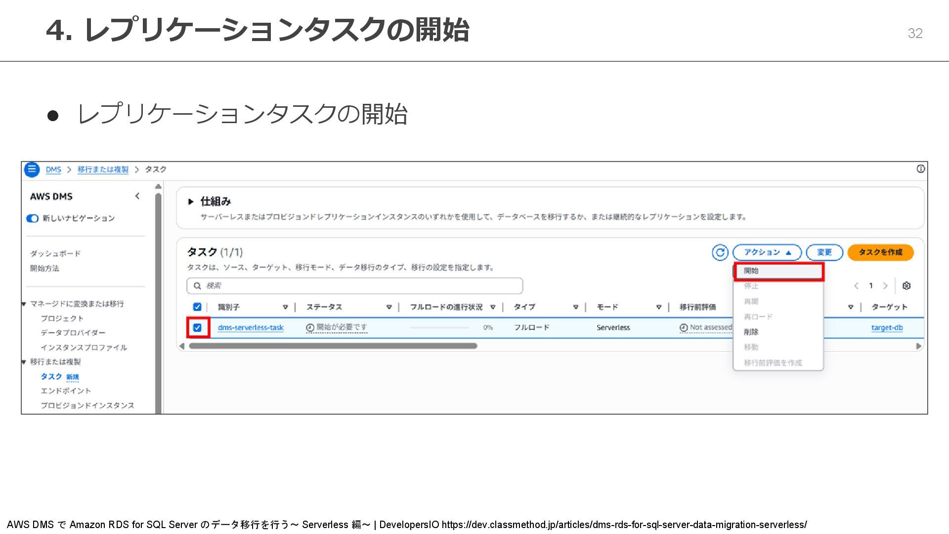 24. 32 ⚫ レプリケーションタスクの開始 4. レプリケーションタスクの開始 AWS DMS で Amazon RDS