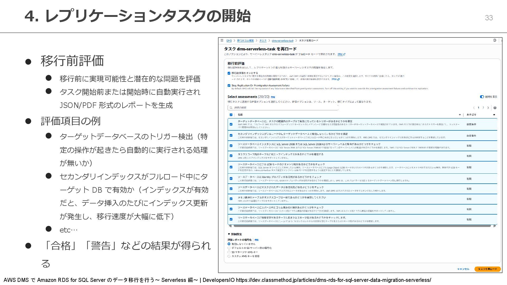 評価項目の例 ⚫ ターゲットデータベースのトリガー検出(特 定の操作が起きたら自動的に実行される処理 が無いか) ⚫ セカンダリインデックスがフルロード中にタ ーゲット DB で有効か(インデックスが有効 だと、データ挿入のたびにインデックス更新 が発生し、移行速度が大幅に低下) ⚫ etc… ⚫ 「合格」「警告」などの結果が得られ る 4. レプリケーションタスクの開始 AWS DMS で Amazon RDS for SQL Server のデータ移行を行う~ Serverless 編~ | DevelopersIO https://dev.classmethod.jp/articles/dms-rds-for-sql-server-data-migration-serverless/
