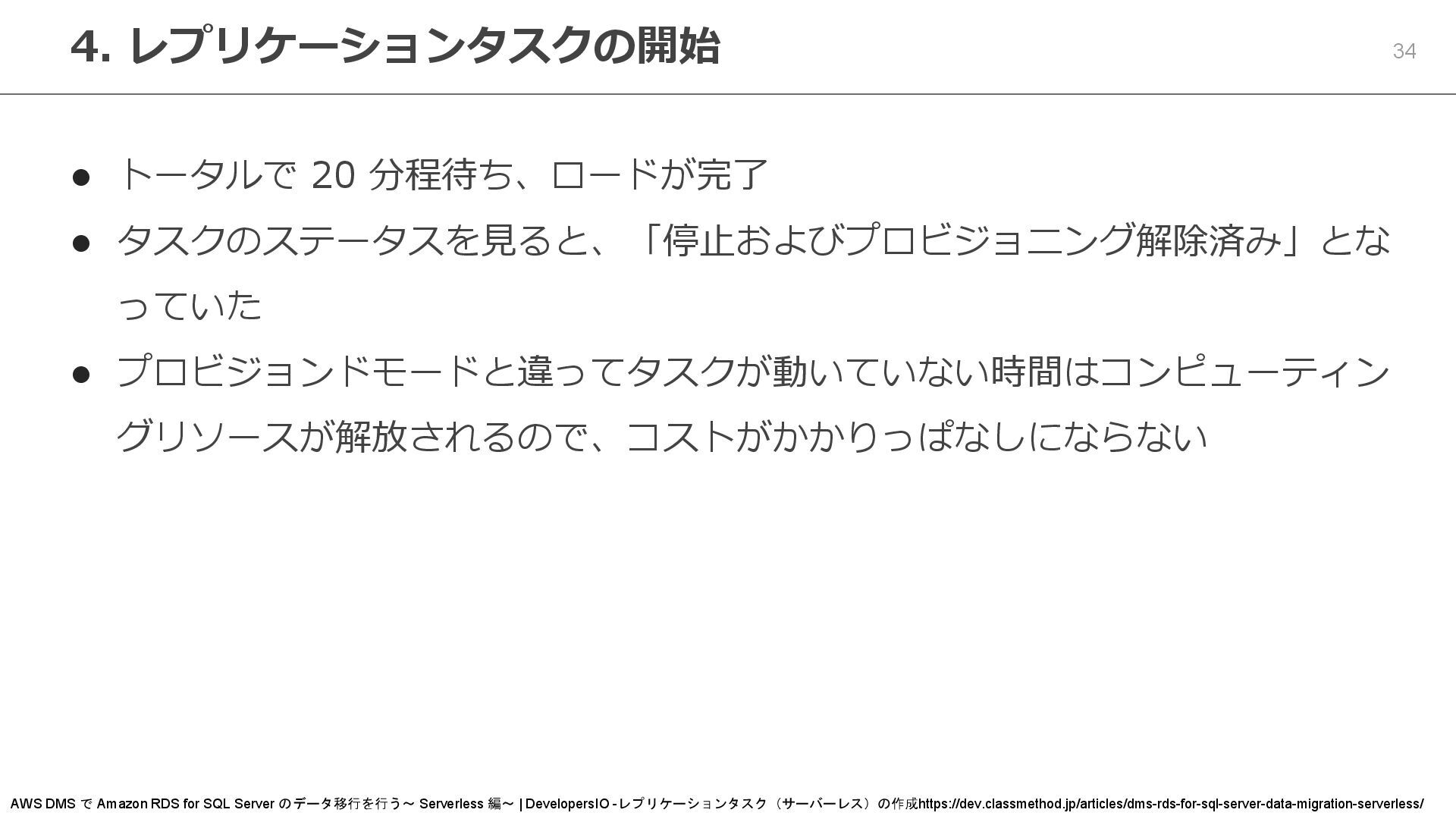 グリソースが解放されるので、コストがかかりっぱなしにならない 4. レプリケーションタスクの開始 AWS DMS で Amazon RDS for SQL Server のデータ移行を行う~ Serverless 編~ | DevelopersIO -レプリケーションタスク(サーバーレス)の作成https://dev.classmethod.jp/articles/dms-rds-for-sql-server-data-migration-serverless/
