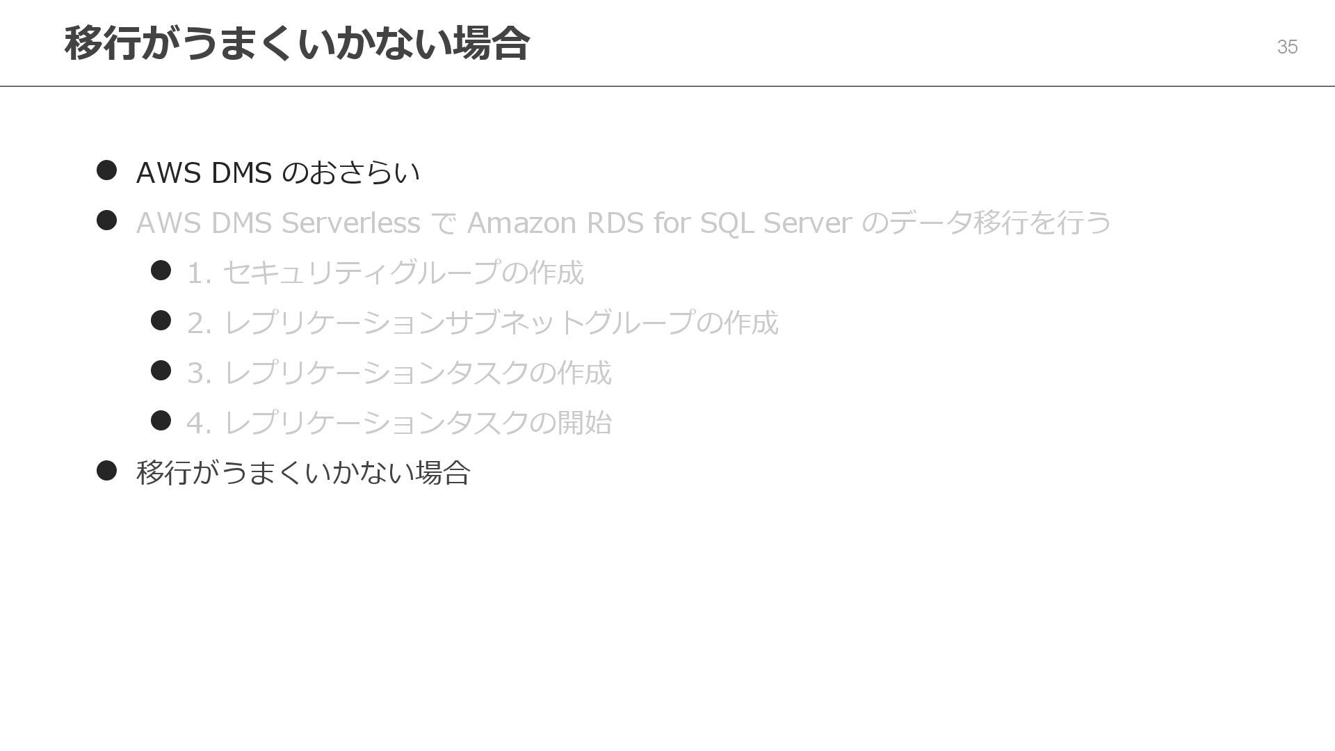 27. 移行がうまくいかない場合 35 ⚫ AWS DMS のおさらい ⚫ AWS DMS Serverless
