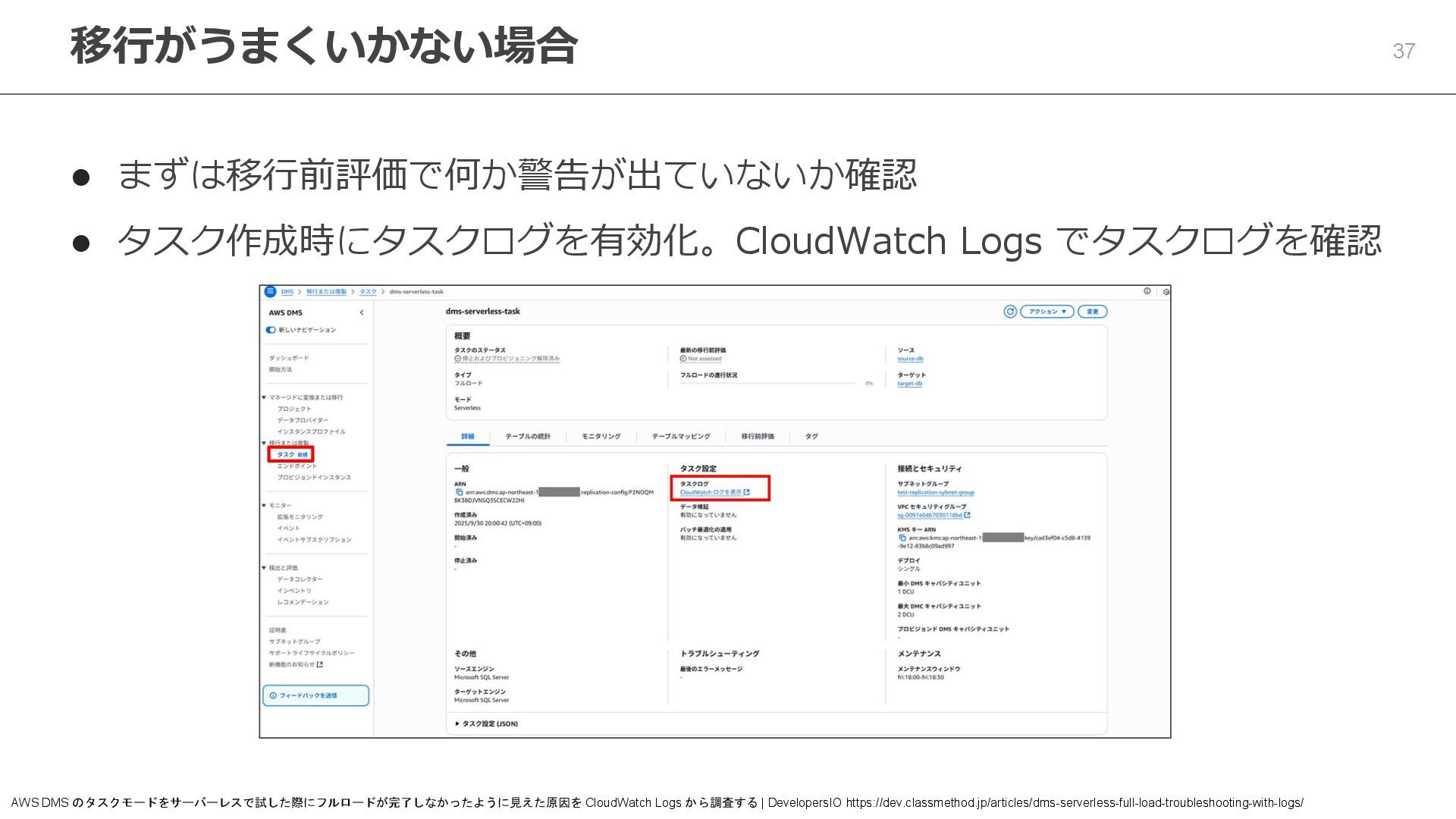 28. 37 ⚫ まずは移行前評価で何か警告が出ていないか確認 ⚫ タスク作成時にタスクログを有効化。CloudWatch Logs でタスクログを確認 移行がうまくいかない場合 AWS DMS
