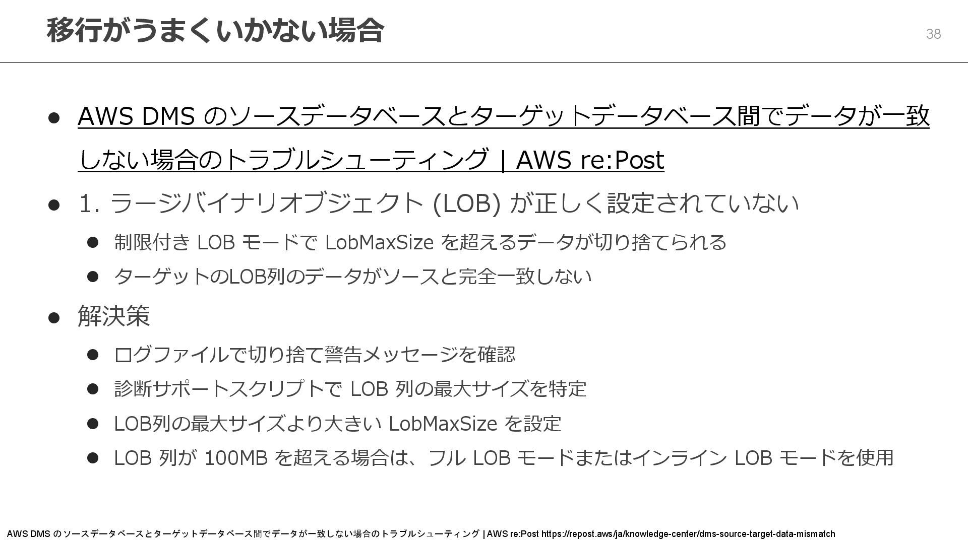 1. ラージバイナリオブジェクト (LOB) が正しく設定されていない ⚫ 制限付き LOB モードで LobMaxSize を超えるデータが切り捨てられる ⚫ ターゲットのLOB列のデータがソースと完全一致しない ⚫ 解決策 ⚫ ログファイルで切り捨て警告メッセージを確認 ⚫ 診断サポートスクリプトで LOB 列の最大サイズを特定 ⚫ LOB列の最大サイズより大きい LobMaxSize を設定 ⚫ LOB 列が 100MB を超える場合は、フル LOB モードまたはインライン LOB モードを使用 移行がうまくいかない場合 AWS DMS のソースデータベースとターゲットデータベース間でデータが一致しない場合のトラブルシューティング | AWS re:Post https://repost.aws/ja/knowledge-center/dms-source-target-data-mismatch